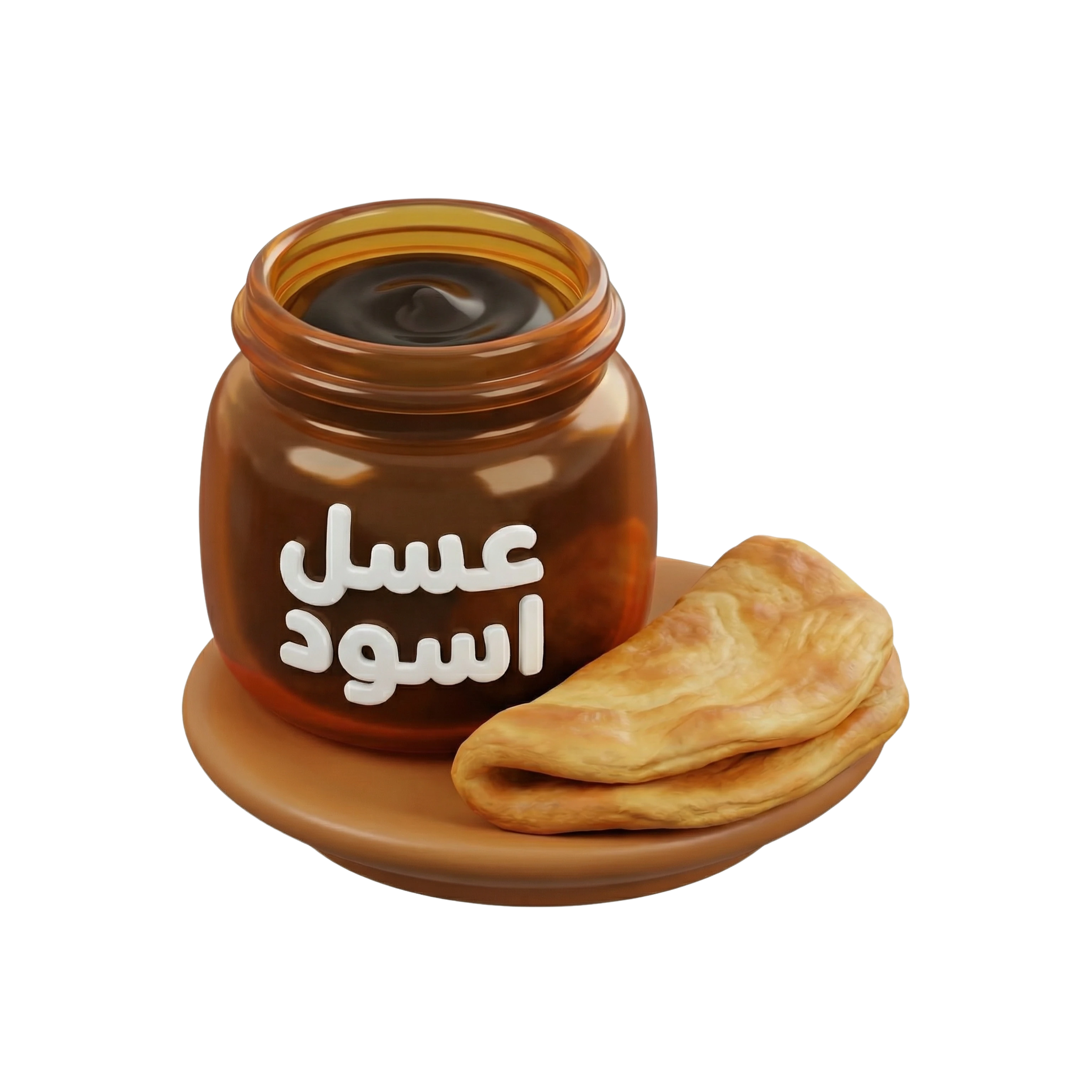 A classic Egyptian pairing of crispy, buttery feteer meshaltet served with rich, dark black honey (molasses). The feteer is golden, flaky, and tender, perfectly complementing the deep caramel notes of the sweet syrup.