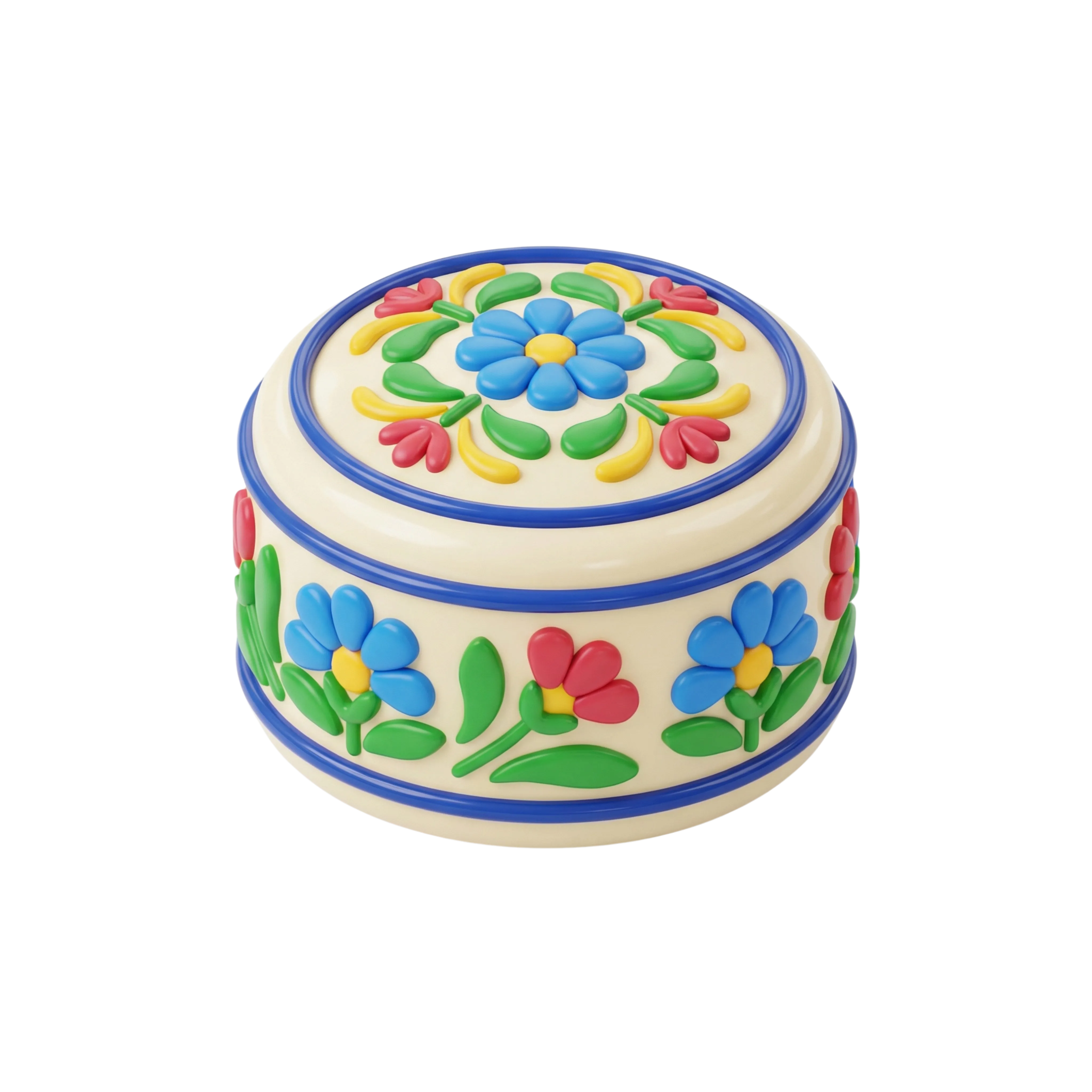 A high-quality 3D render of a traditional pearl storage box featuring vibrant floral motifs and a smooth, glossy finish. This ornamental container is inspired by heritage Gulf design aesthetics, commonly used for storing jewelry or keepsakes.