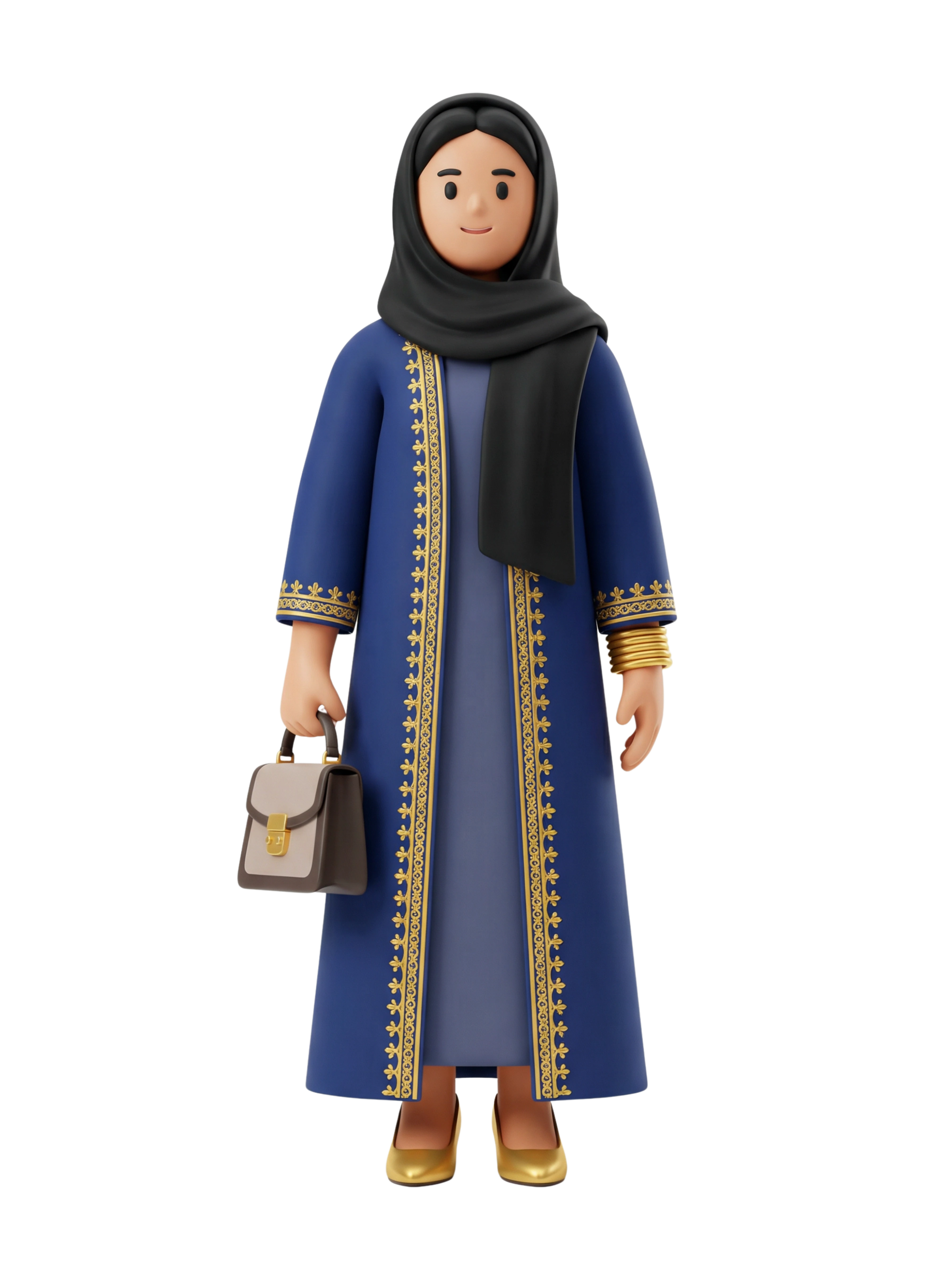A poised Gulf businesswoman stands confidently in a traditional embroidered abaya, blending cultural elegance with professional purpose.