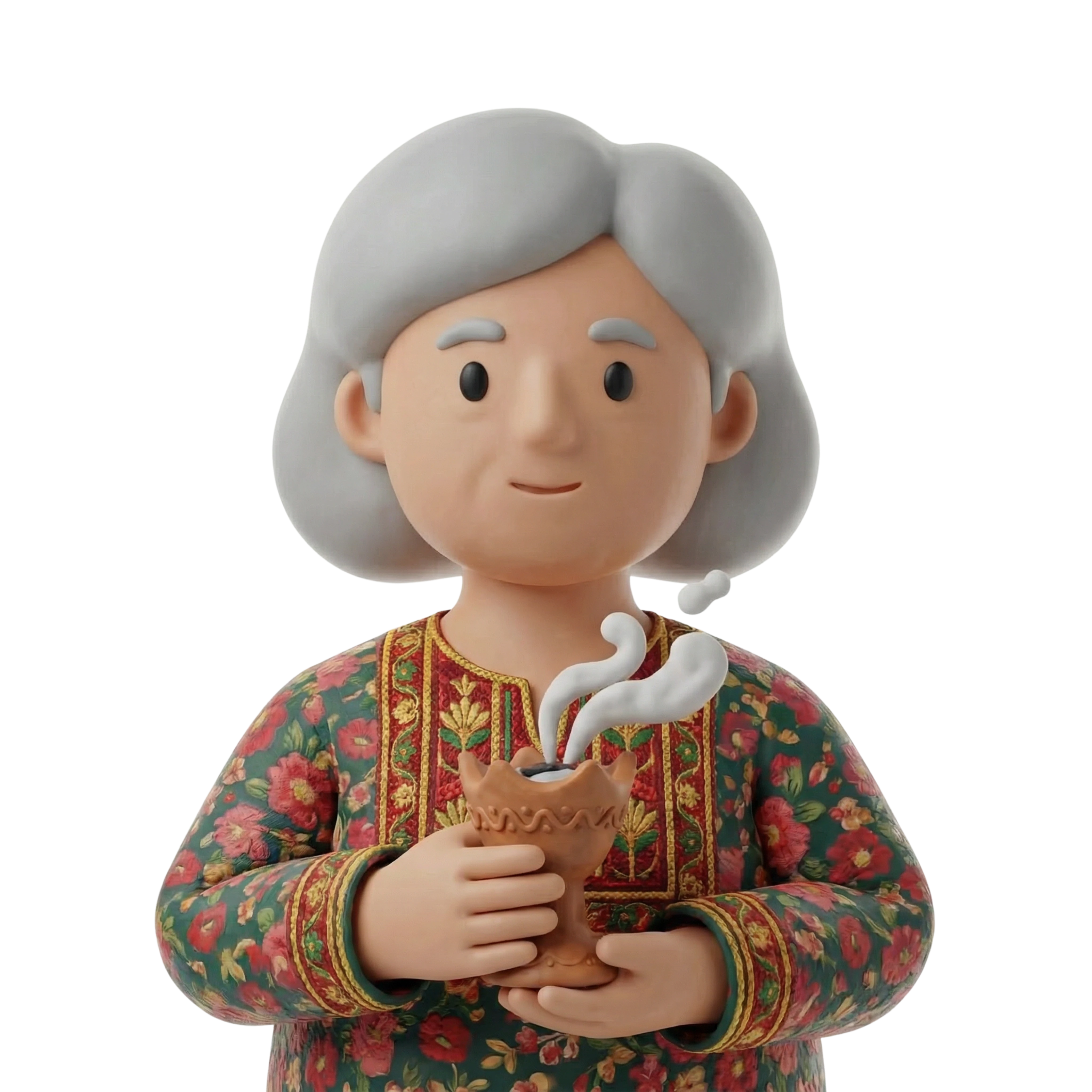 جدّة خليجية دافئة ومهيبة تقدم مبخرة، تجسد قيم الضيافة والتراث والعادات الأصيلة في ثقافة الخليج.