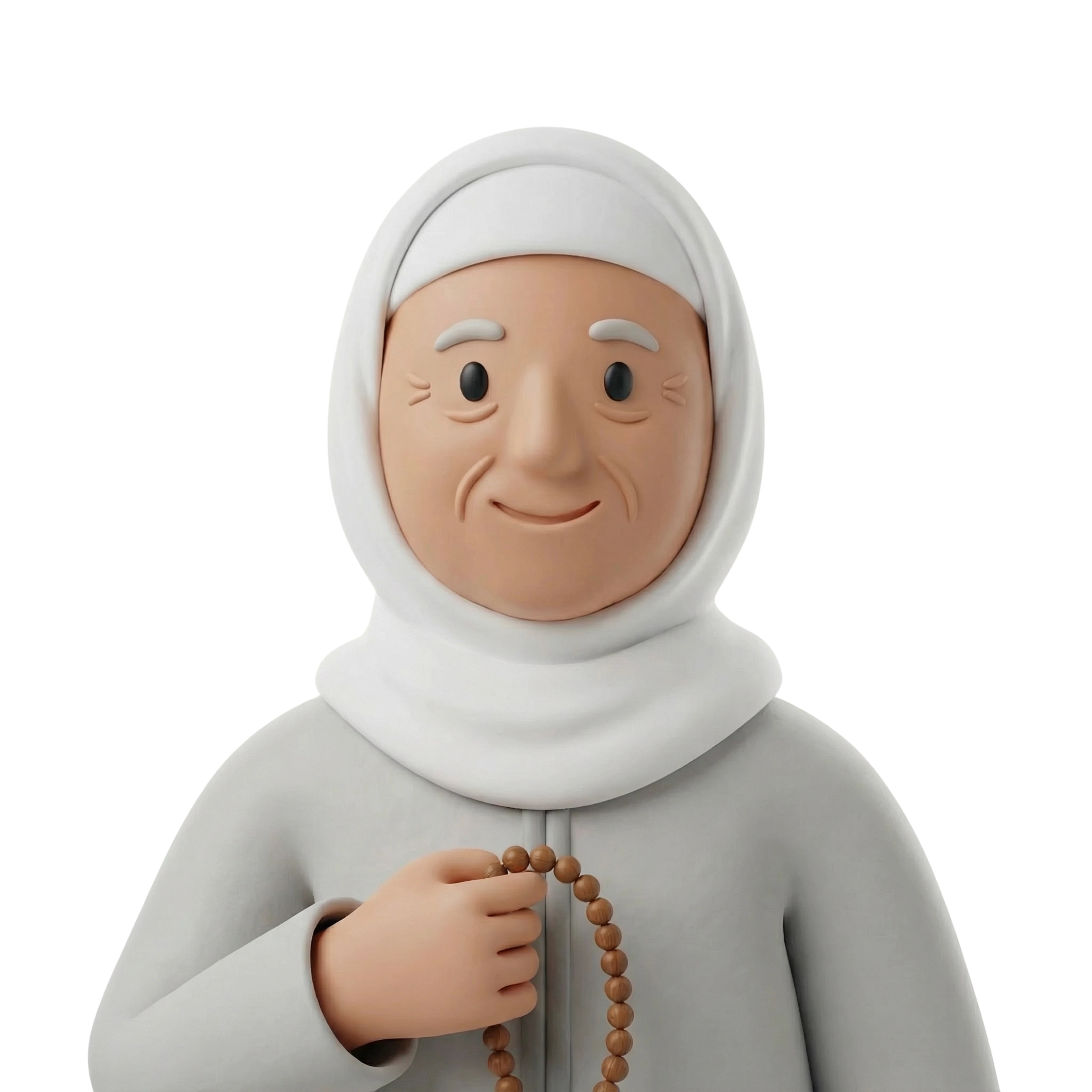 جدة حنونة تحمل مسبحة، تعكس روحانية عالية وقيم الأسرة التقليدية في ثقافة الخليج.