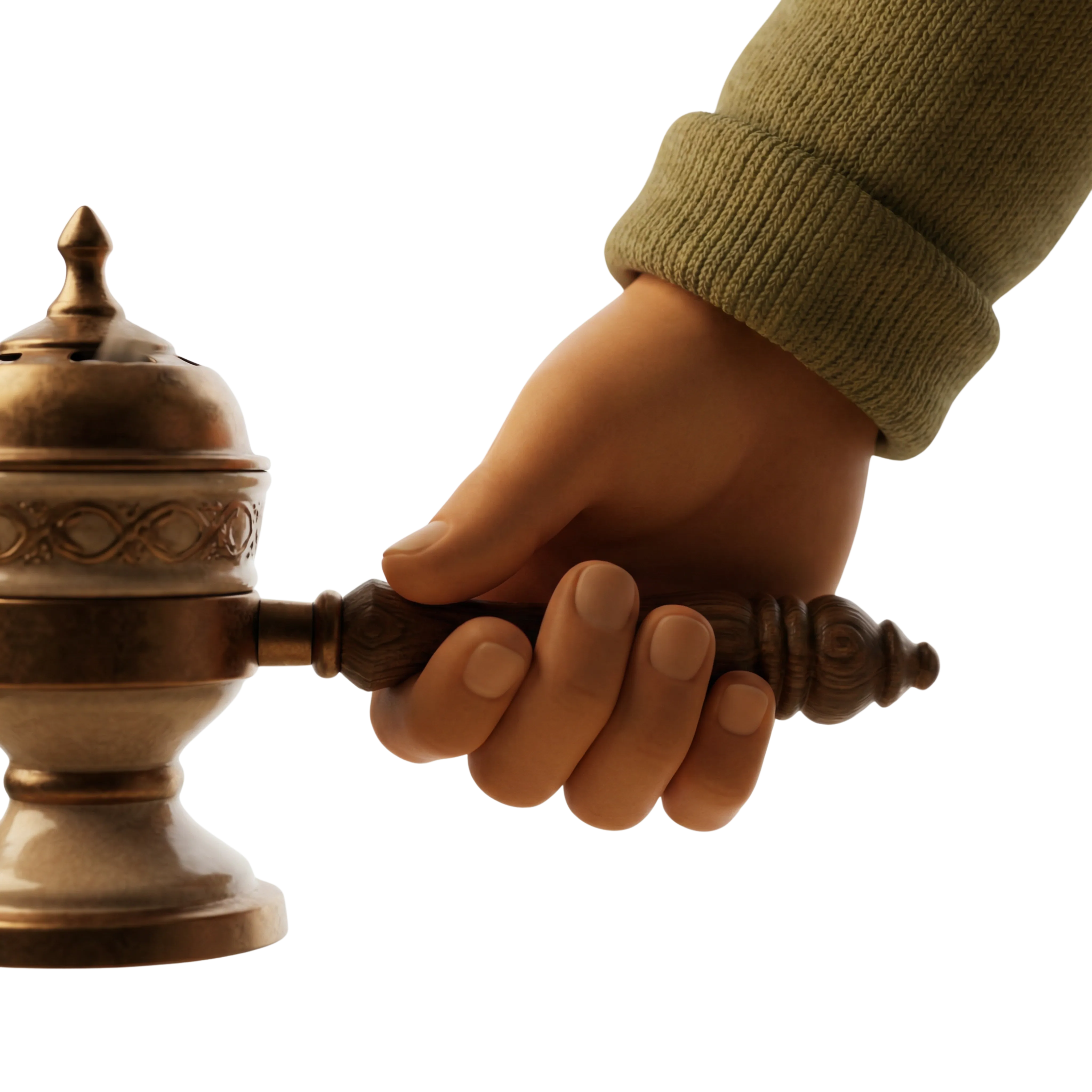 A high-quality 3D depiction of a traditional Gulf-style incense burner made from bronze with engraved patterns and a carved wooden handle. Ideal for cultural visualizations, heritage-themed compositions, or hospitality design needing regional authenticity.