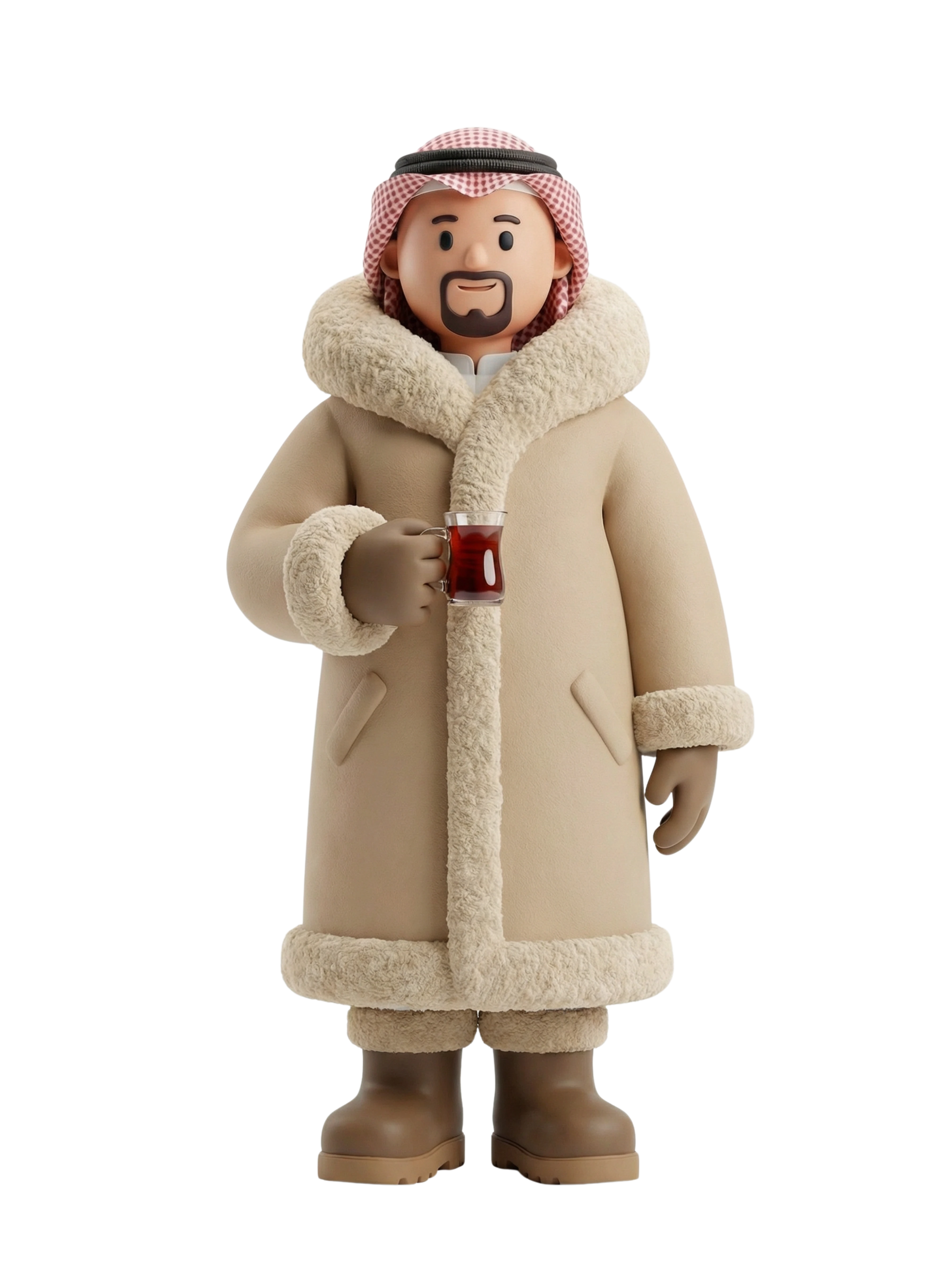 شخصية مخيم خليجية دافئة وودودة تستمتع بالشاي التقليدي في أجواء الشتاء الصحراوية، مرتدية الفروة الثقيلة والغترة كرمز للراحة والفخر الثقافي.
