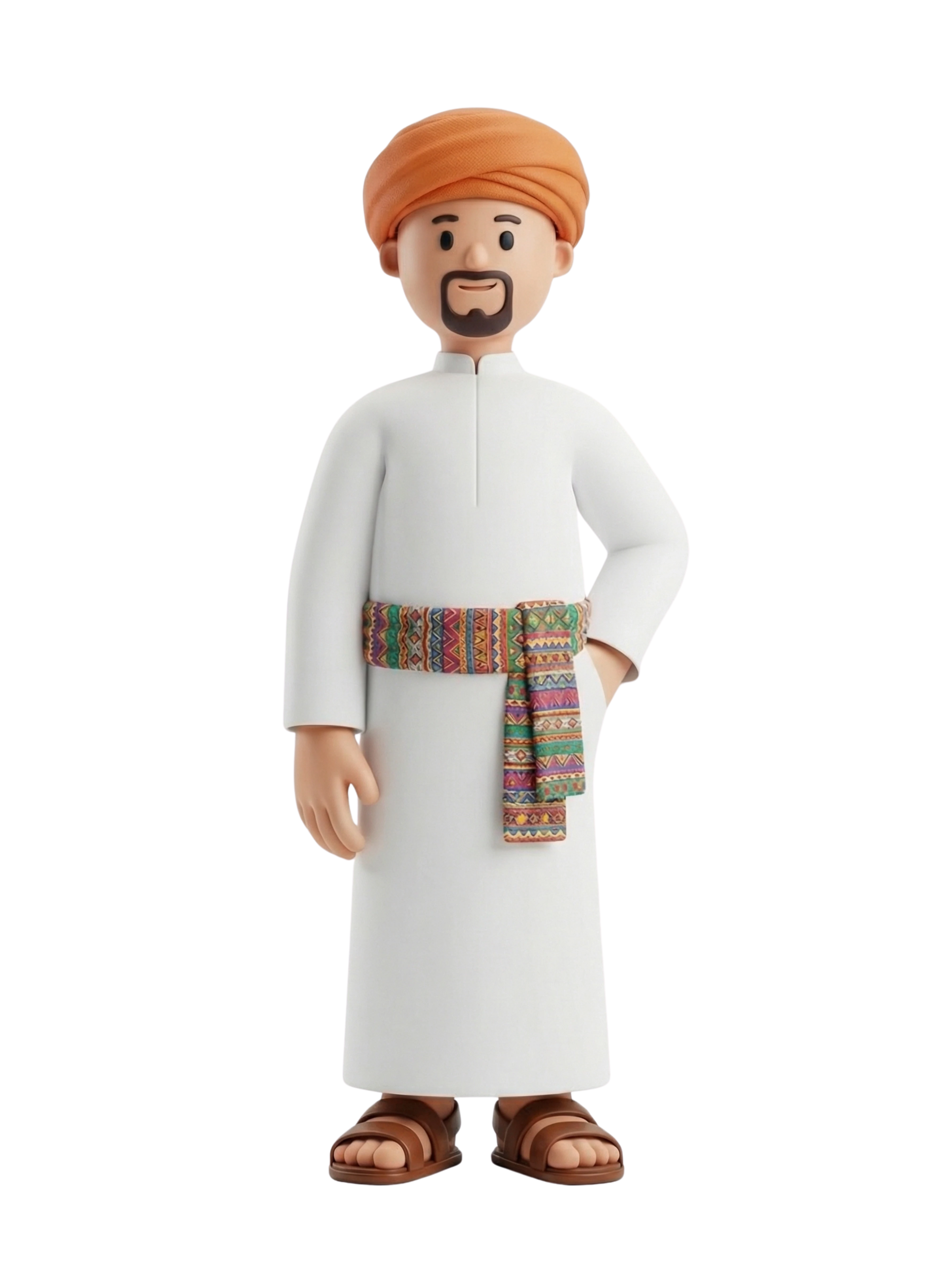 تاجر حجازي تقليدي يقف بثقة مرتديًا ثوبًا أبيض وعمامة برتقالية وحزامًا مزخرفًا، مما يعكس الإرث الثقافي الغني وتاريخ التجارة في غرب السعودية.