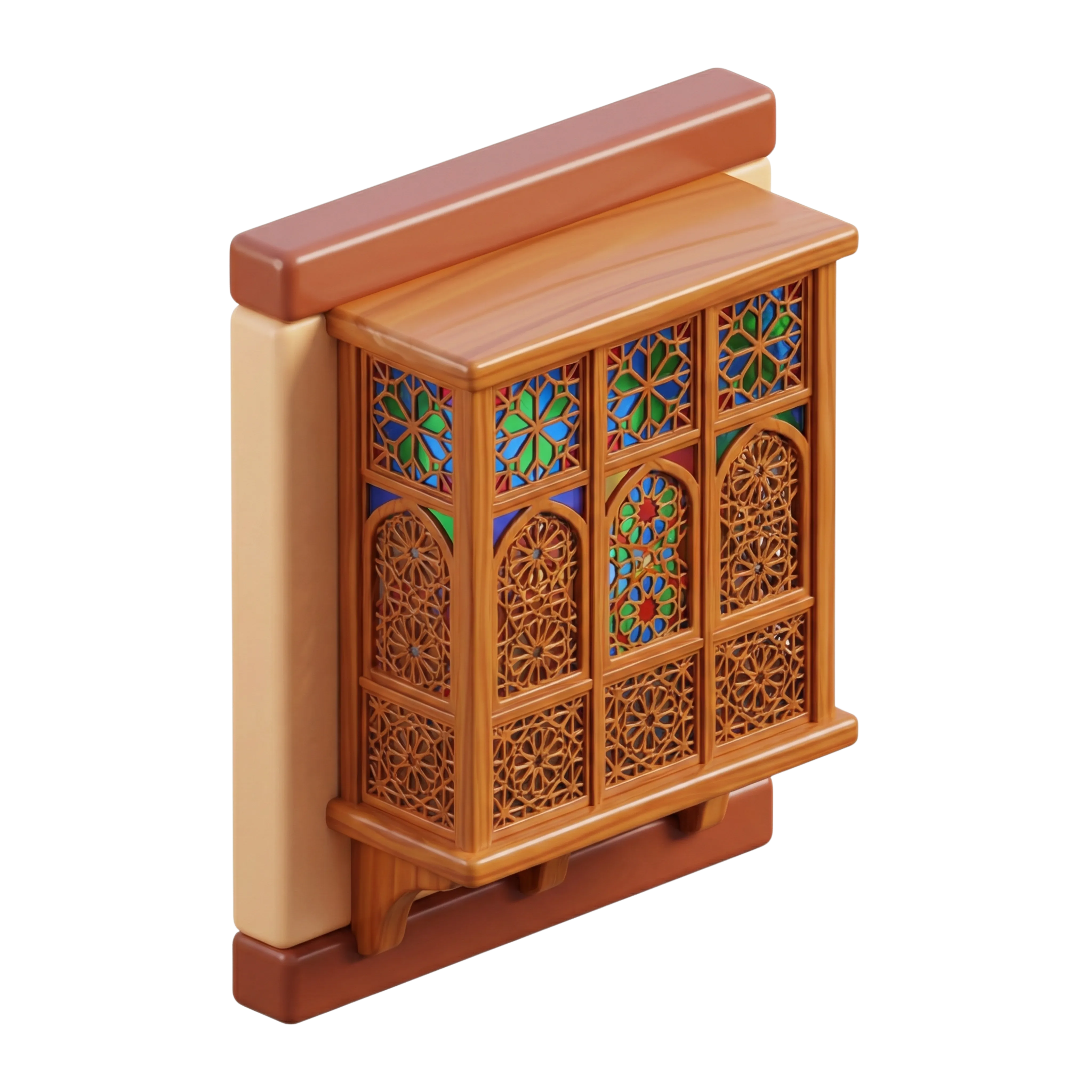 مجسم ثلاثي الأبعاد عالي الجودة لشناشيل عراقية تقليدية، مصنوع من الخشب المنحوت بزخارف هندسية ونوافذ زجاجية ملونة. يتميز بتفاصيل دقيقة وخامة خشبية غير لامعة، مثالي لتصميمات معمارية ومشاريع توثيق التراث الثقافي والبيئة الحضرية القديمة.
