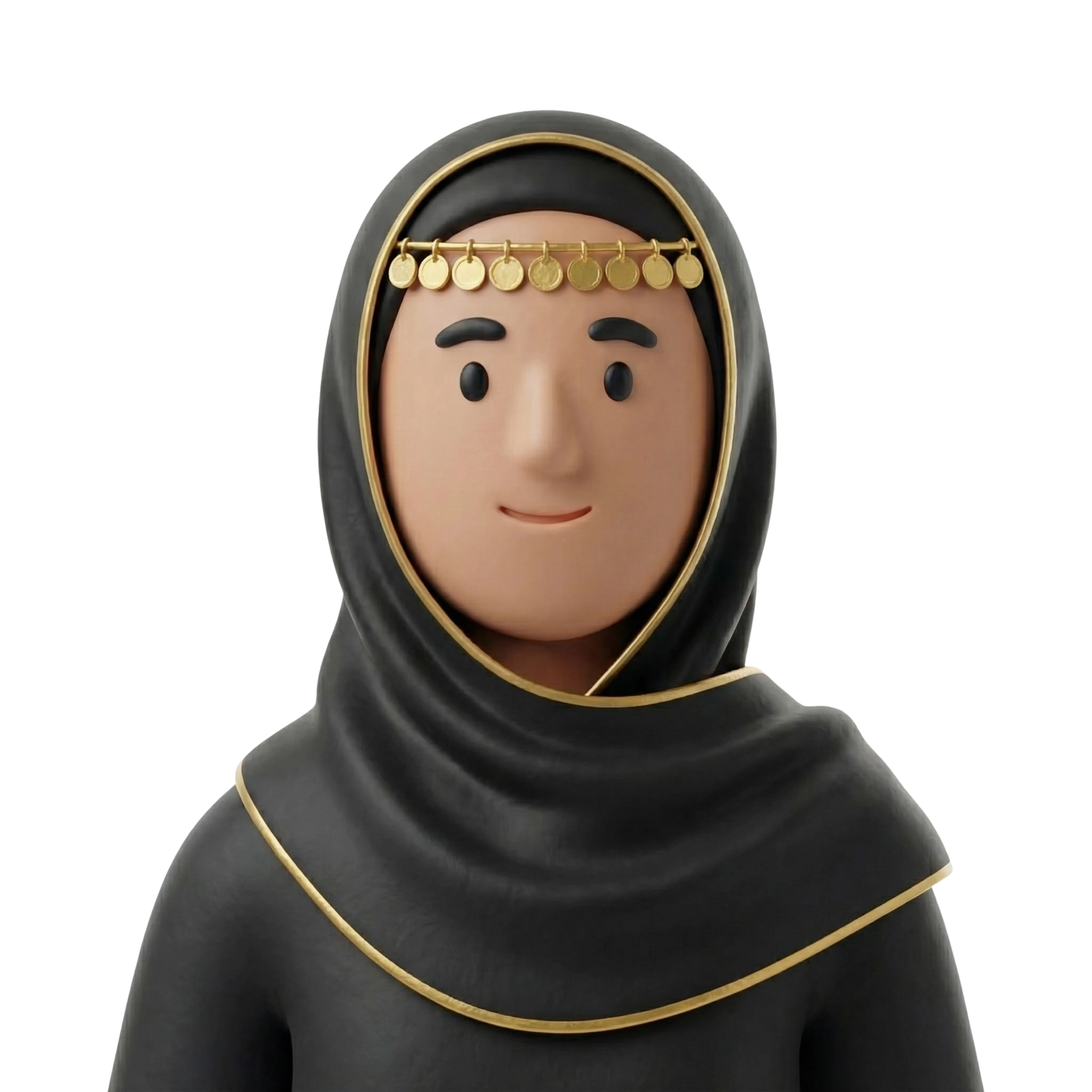 امرأة عراقية أنيقة ترتدي عباءة سوداء تقليدية بحواف ذهبية، وتزين جبهتها بقطعة تراثية من العملات الذهبية تعكس عمق الهوية الثقافية.