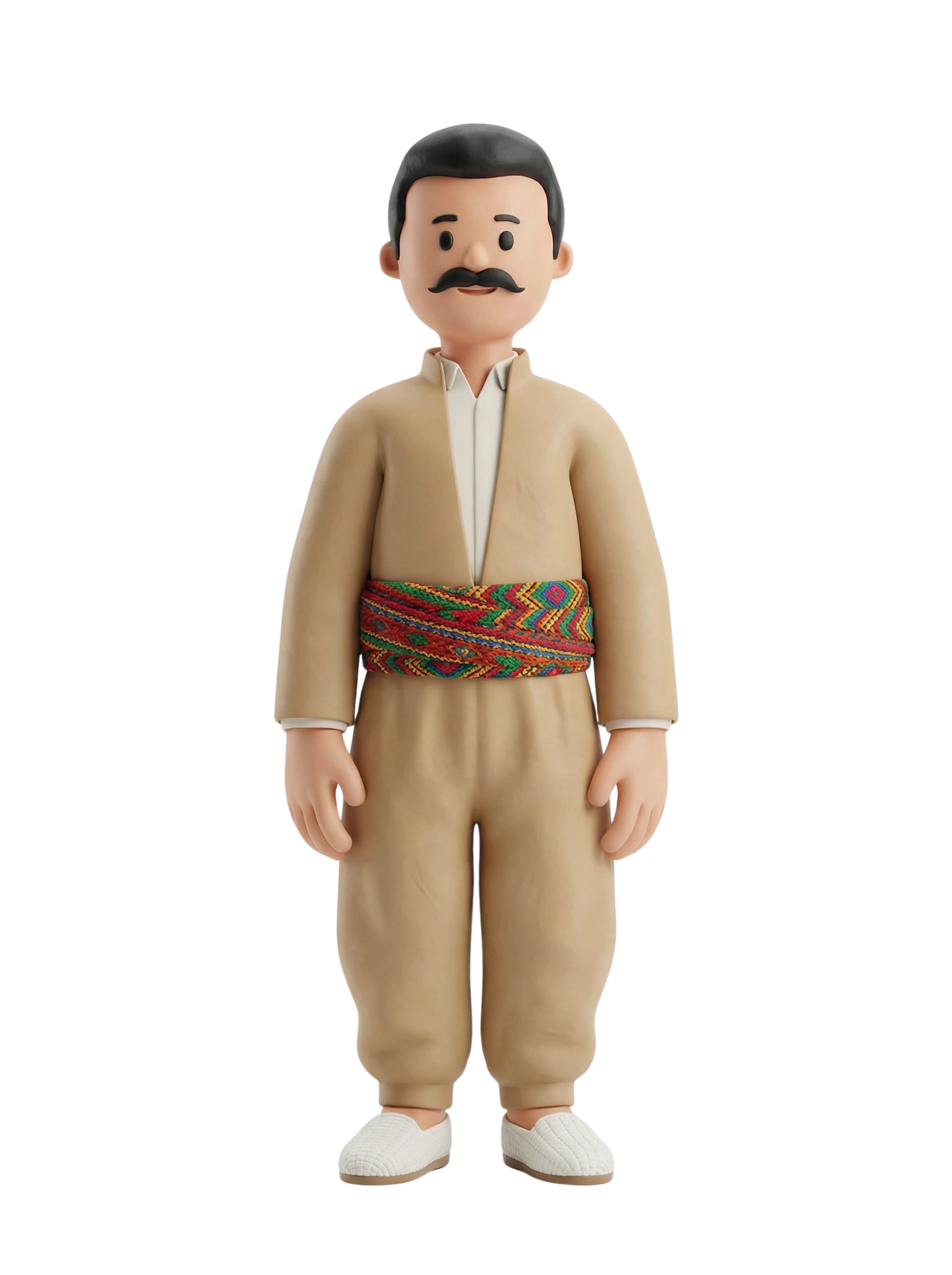 A traditional Kurdish man wearing distinctive regional garments, including a beige outfit and a colorful woven belt, symbolizing ethnic heritage and cultural pride.