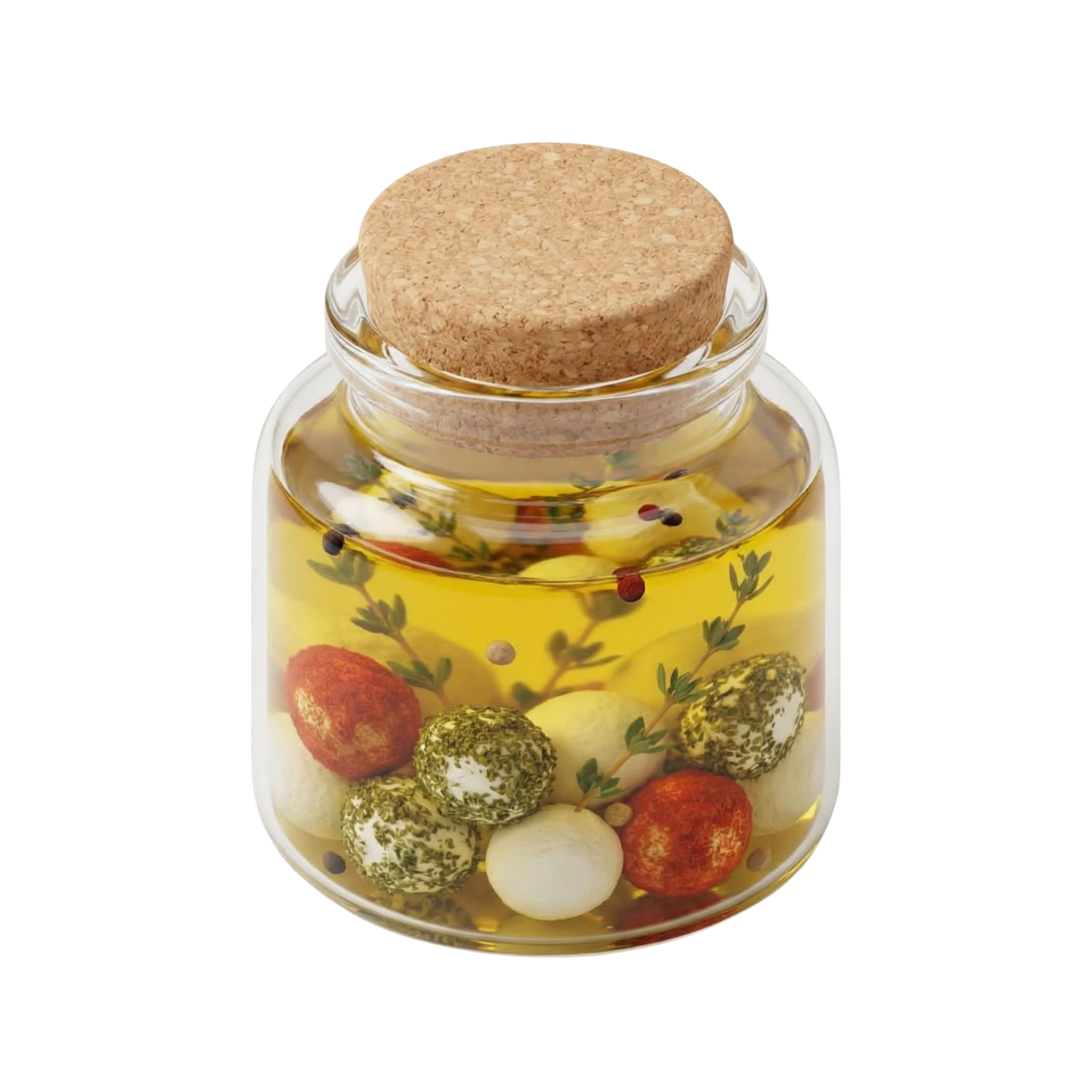 كرات جبنة اللبنة الكريمية مغطاة ببهارات مثل الزعتر والفلفل الحار، ومحفوظة في زيت زيتون فاخر مع أعواد الزعتر وحبوب الفلفل الكاملة. نكهة منعشة وغنية مع قوام ناعم ومزيج لذيذ من التوابل.