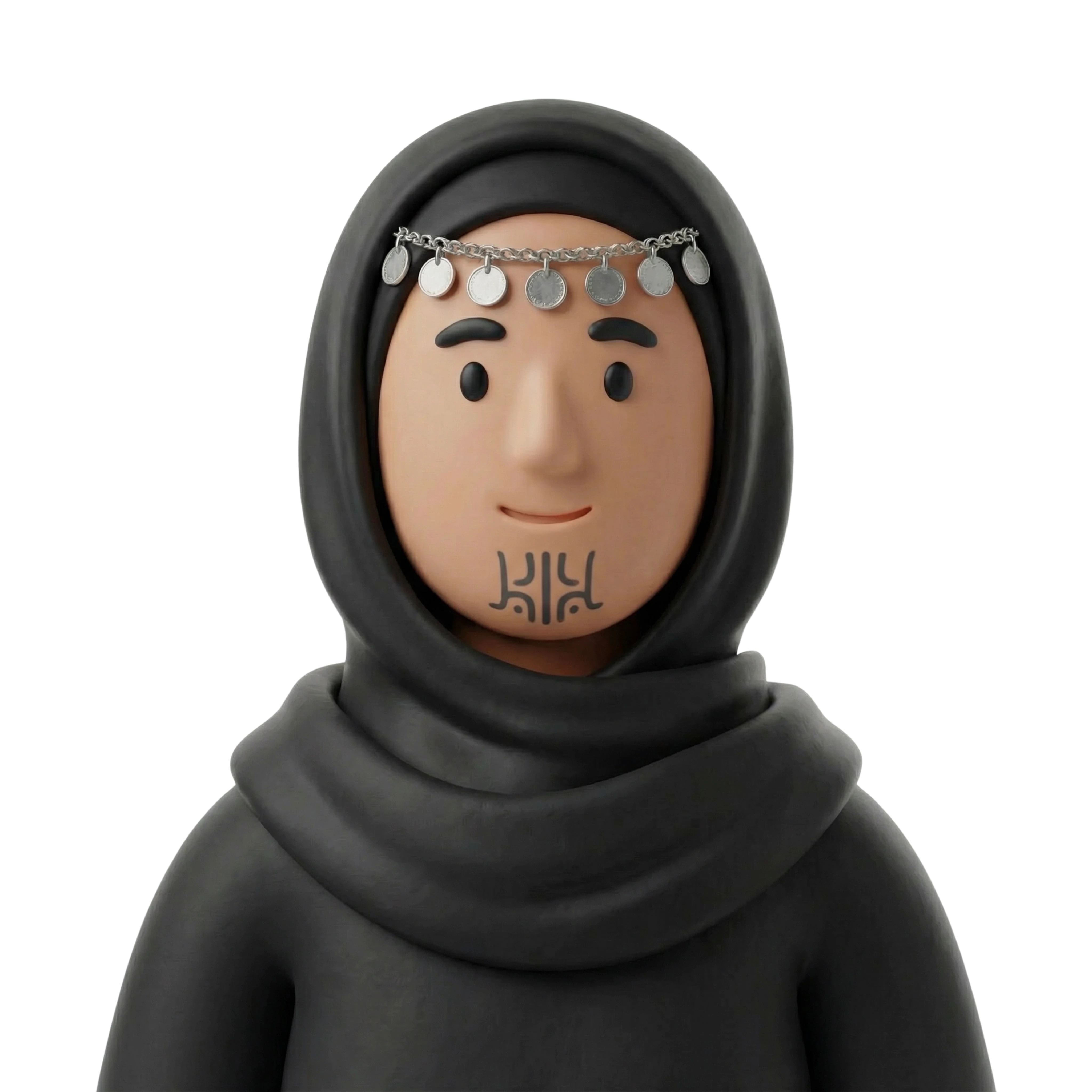 امرأة بدوية شامية تُجسد فخر الإرث الثقافي، ترتدي غطاء رأس تقليدي وزينة معدنية على الجبهة، وتُظهر وشوم الوجه الرمزية التي تعكس الهوية والعادات العريقة.