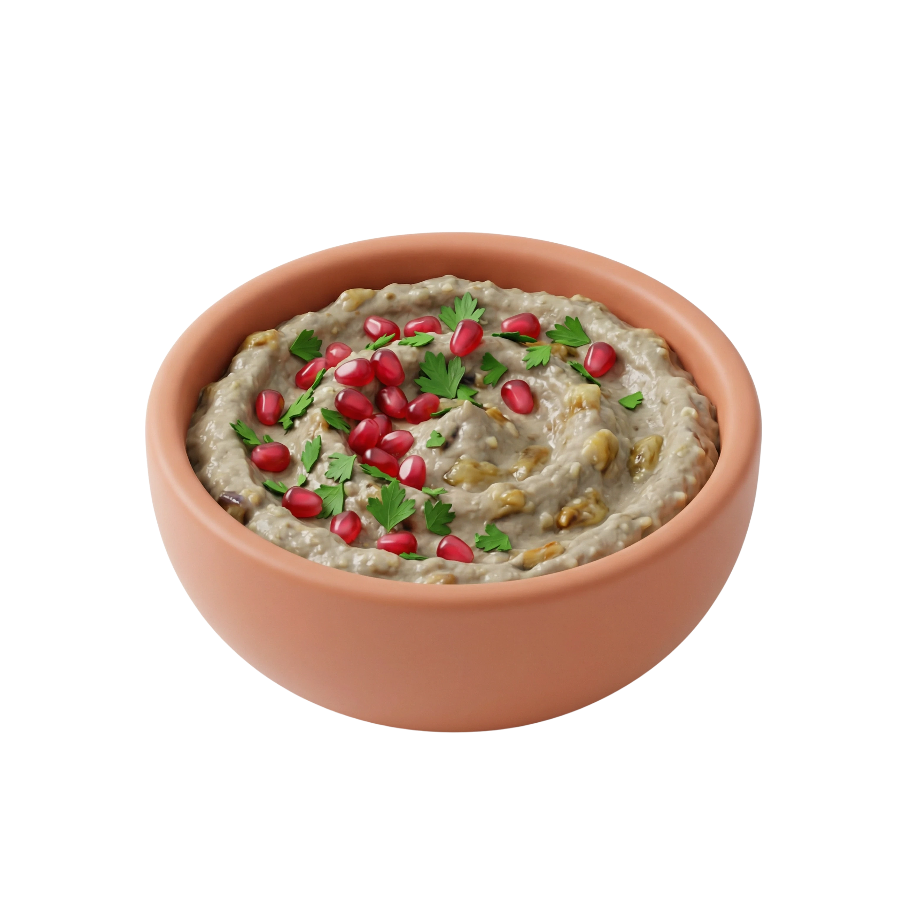 A smoky and velvety eggplant dip blended with tahini, garlic, and lemon juice, garnished with fresh parsley and juicy pomegranate seeds for a burst of flavor and color.