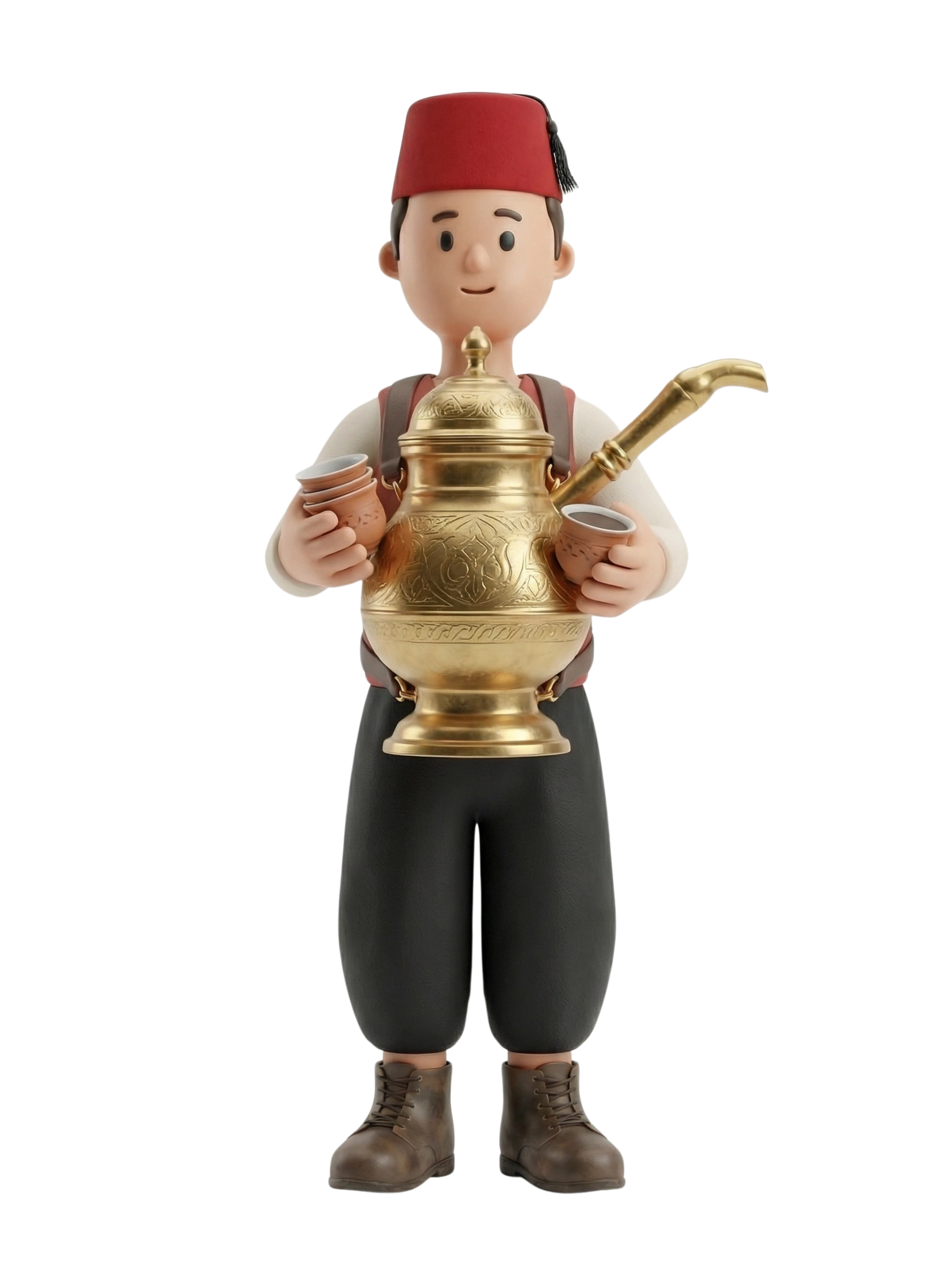 بائع قهوة تقليدي مبتهج يعرض دلة نحاسية مزخرفة وأكواب فخارية صغيرة، يجسد الثقافة الشعبية النابضة في شوارع بلاد الشام.
