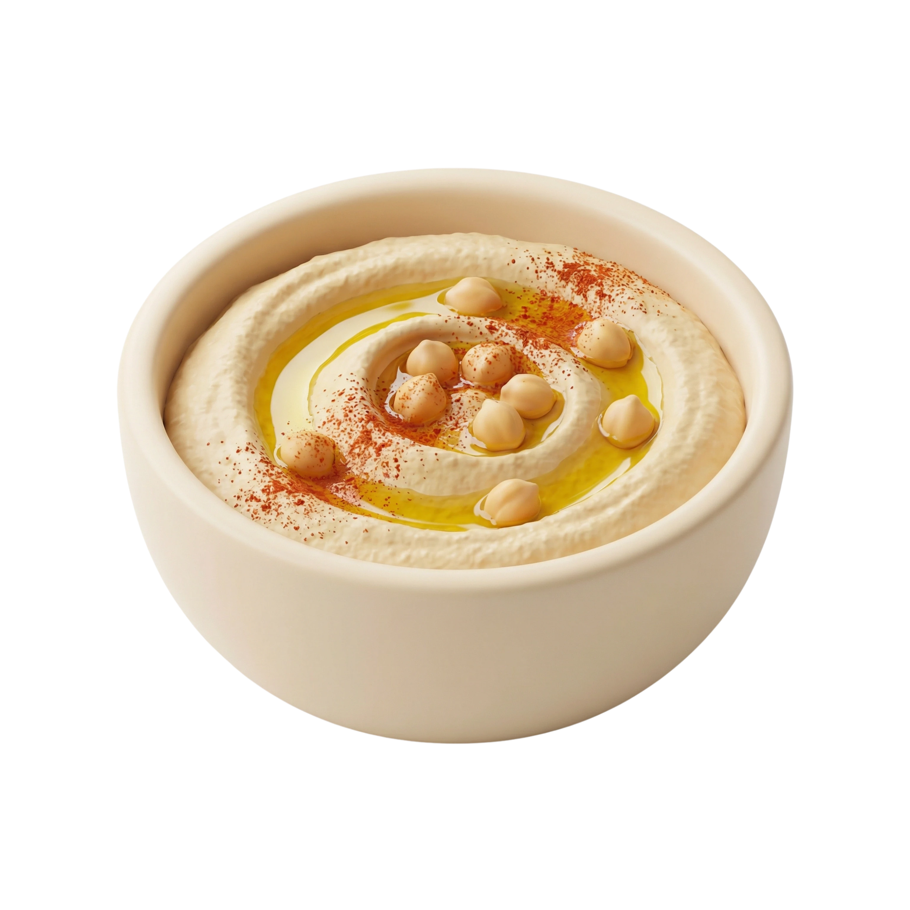 حمص ناعم بلمسة كريمية، مصنوع من الحمص، الطحينة، عصير الليمون، والثوم. يُزين بحبات حمص كاملة، ورشة بابريكا، ولمسة من زيت الزيتون البكر ليمنح طعماً متوازناً بين الحموضة اللطيفة والنكهة الغنية.