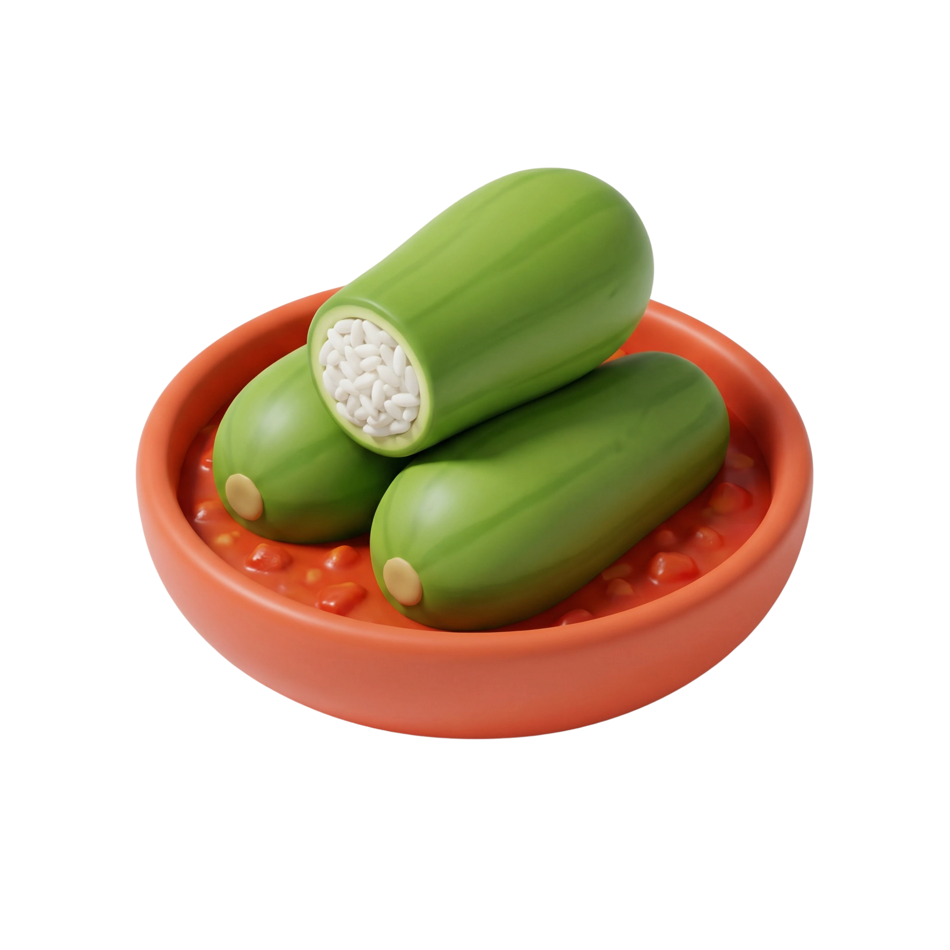 أعواد الكوسا الطرية محشوة بالأرز المتبل وأحيانًا باللحم المفروم، ومطهوة برقة في صلصة طماطم شهية. كل قضمة تمزج بين نعومة الكوسا ونكهة الأرز العطري المغلّف بمذاق الطماطم اللاذع.