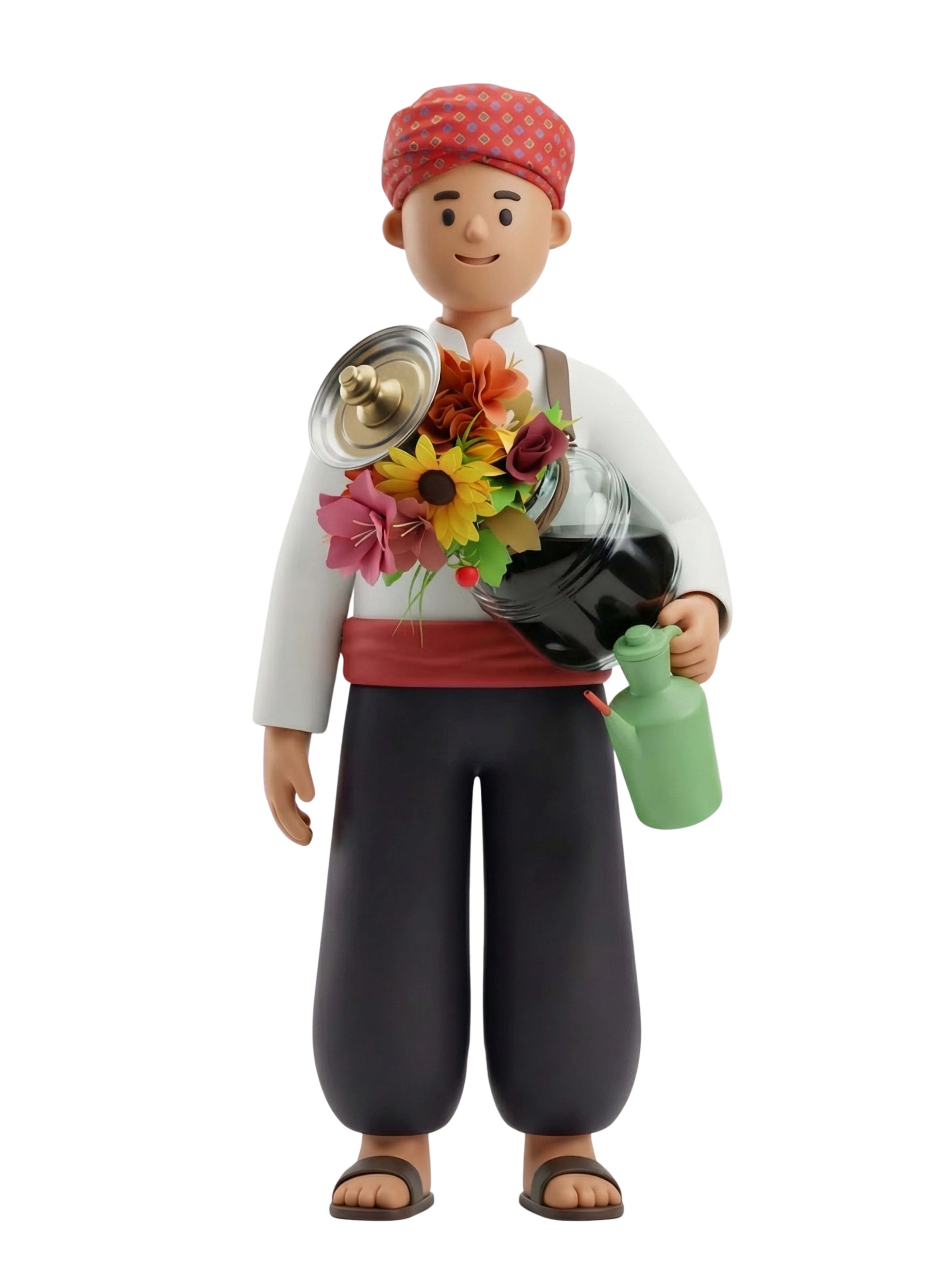 بائع شارع مرح يرتدي الزي التقليدي لبلاد الشام يقدم مشروب السوس المنعش من إبريق محمول على الكتف ومزخرف بأزهار ورقية زاهية، يعكس أجواء الأسواق القديمة والمناسبات التراثية.