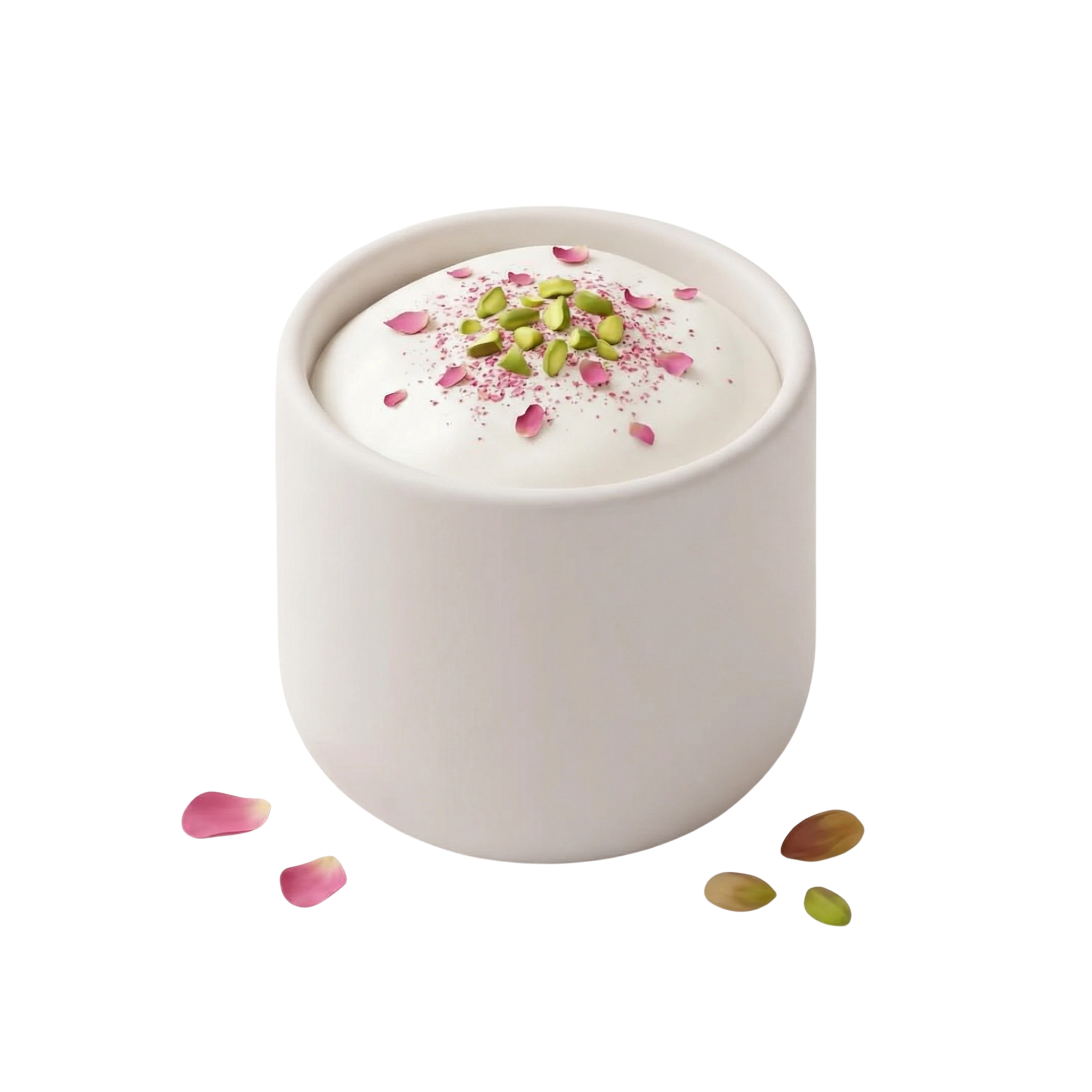 المهلبية هي حلوى لبنية ناعمة وحريرية الملمس، بطعم حلو خفيف مع لمسة من ماء الورد أو زهر البرتقال. تُزيَّن بالفستق المجروش وورد مجفف لإضفاء قرمشة خفيفة ونكهة زهرية منعشة تُكمل نعومة الحلى.