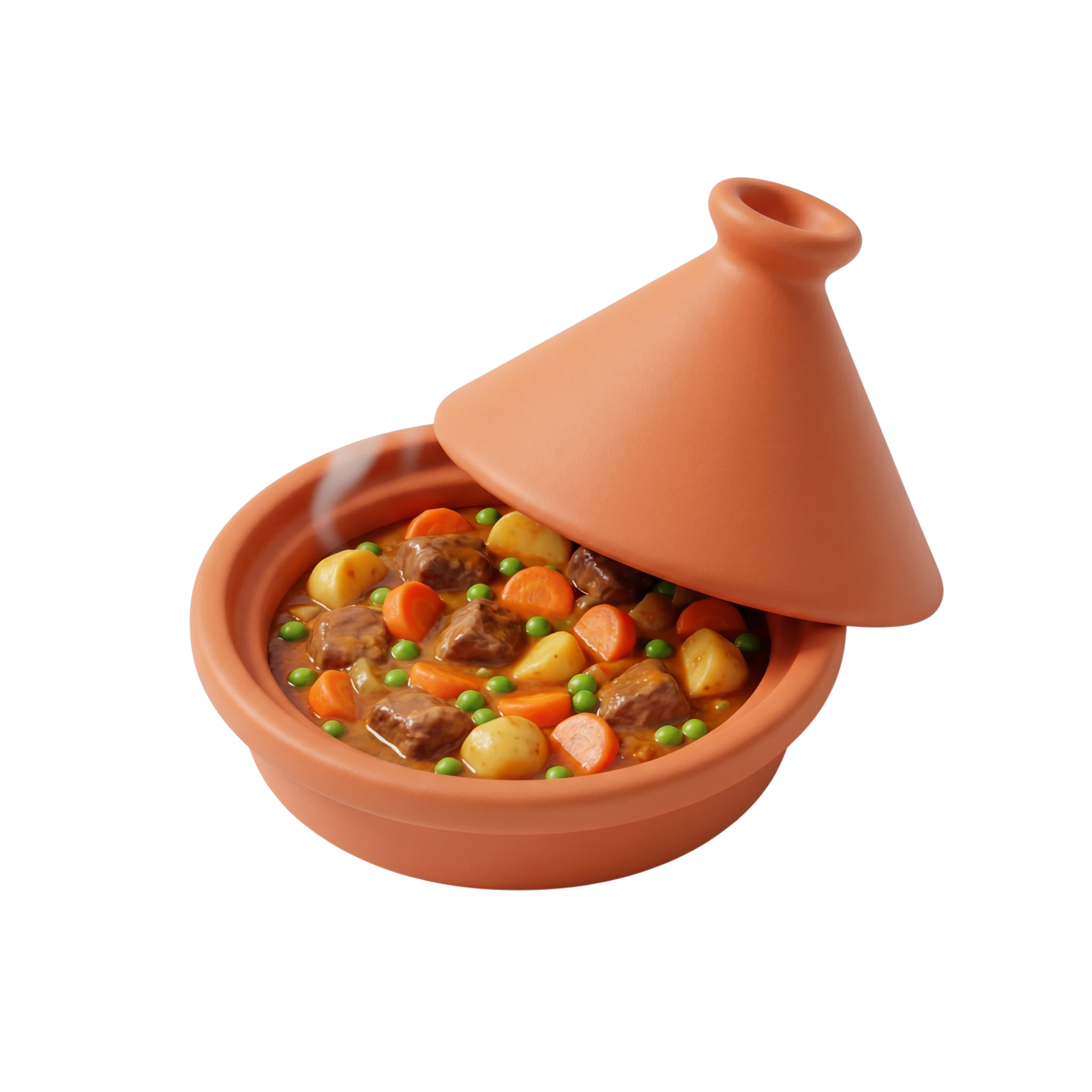 قطع لحم طرية مطهية ببطء في طاجين مغربي تقليدي مع بطاطس صغيرة، وجزر حلو، وبازلاء خضراء، ومتبلة بتوابل مغربية دافئة مثل القرفة والكمون والكركم. يخنة عطرية وغنية تذوب في الفم مع كل لقمة.