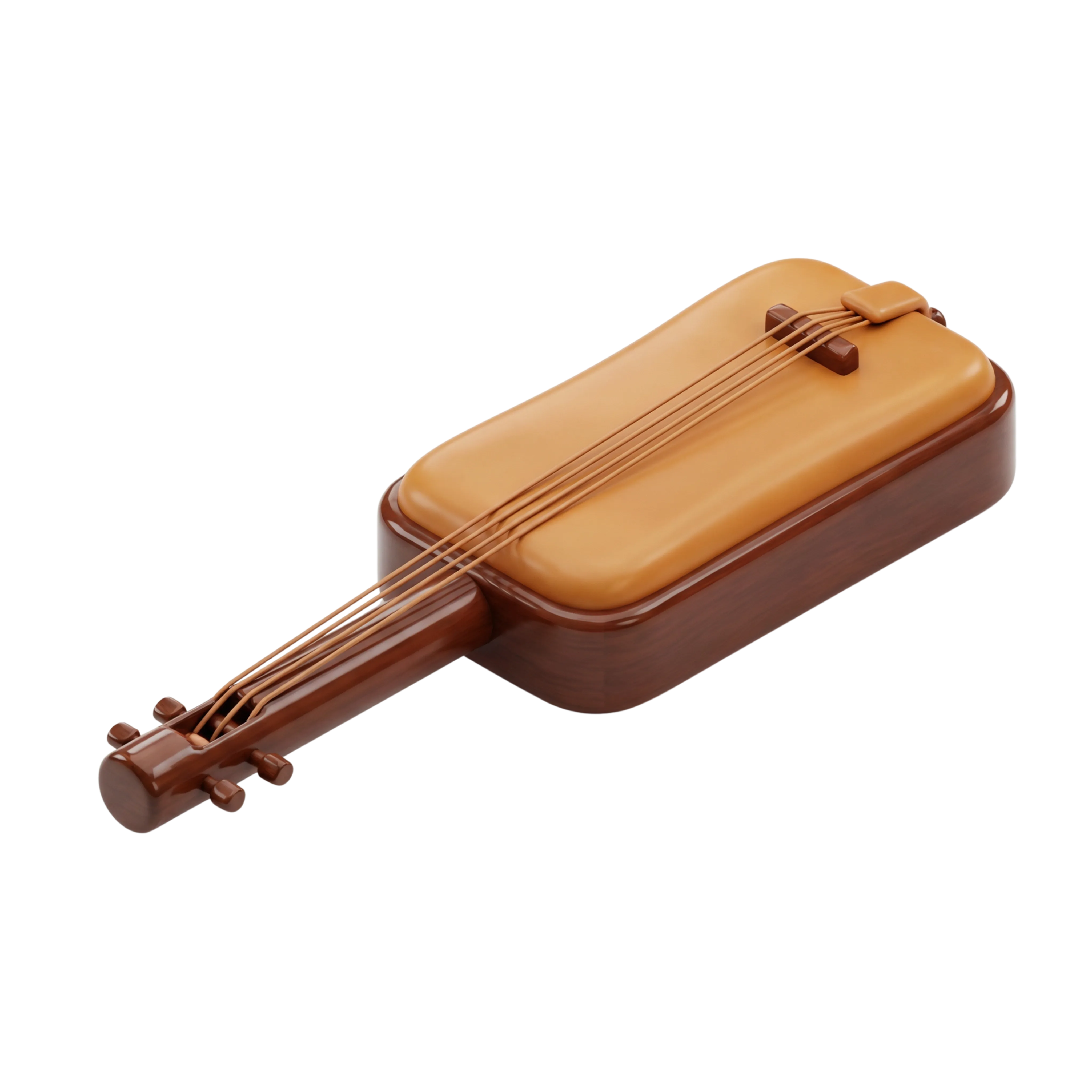 A detailed 3D render of a Guembri, a traditional Moroccan string instrument often used in Gnawa music. The model features a rich brown wooden frame with a matte tan top resembling animal skin, and realistic string detailing. Ideal for animations, cultural education, and heritage-themed digital art.