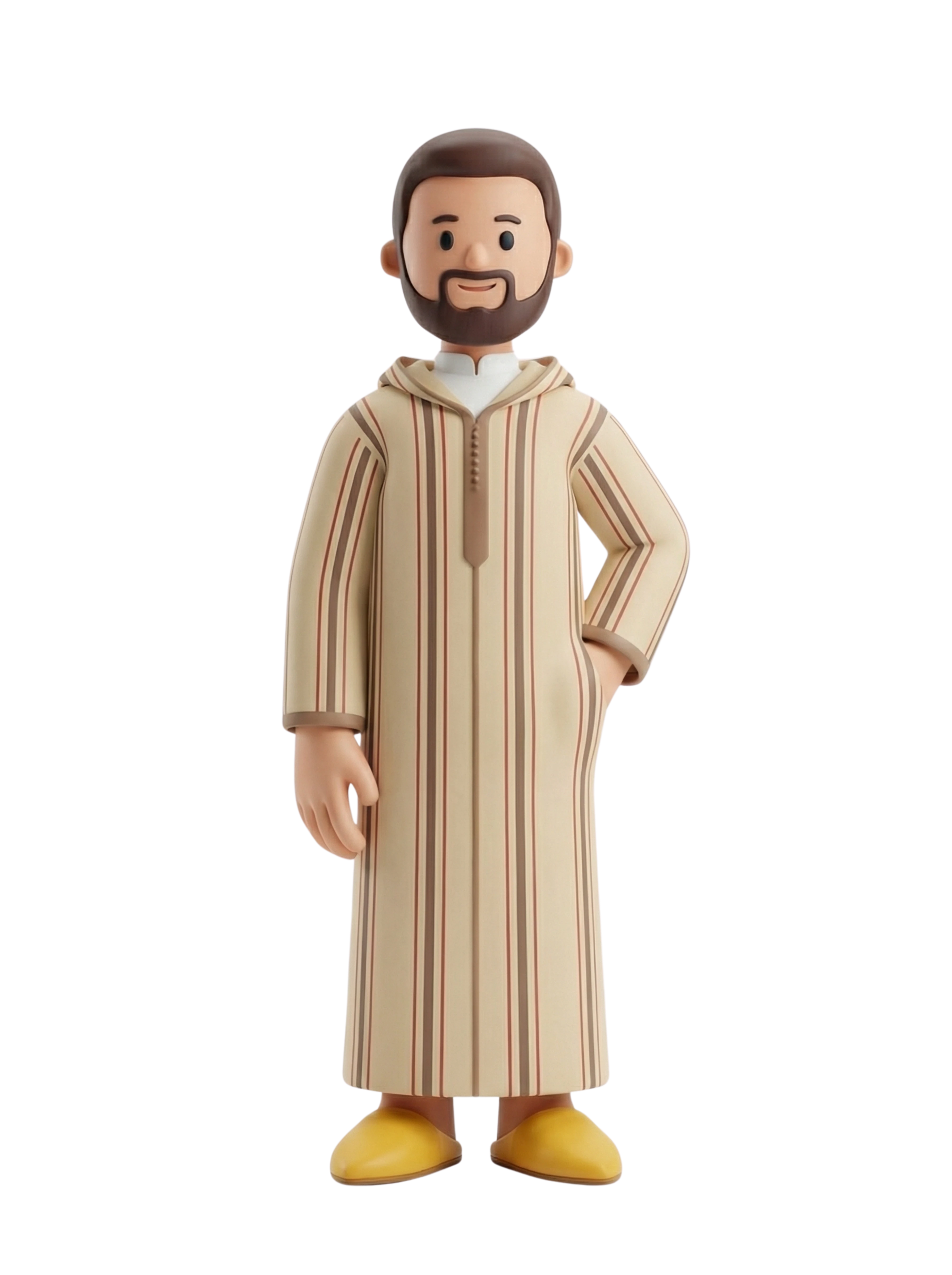 رجل مغربي تقليدي يرتدي جلابية مخططة بألوان البيج والبني وحذاء أصفر، يجسد التراث الثقافي والأناقة البسيطة.