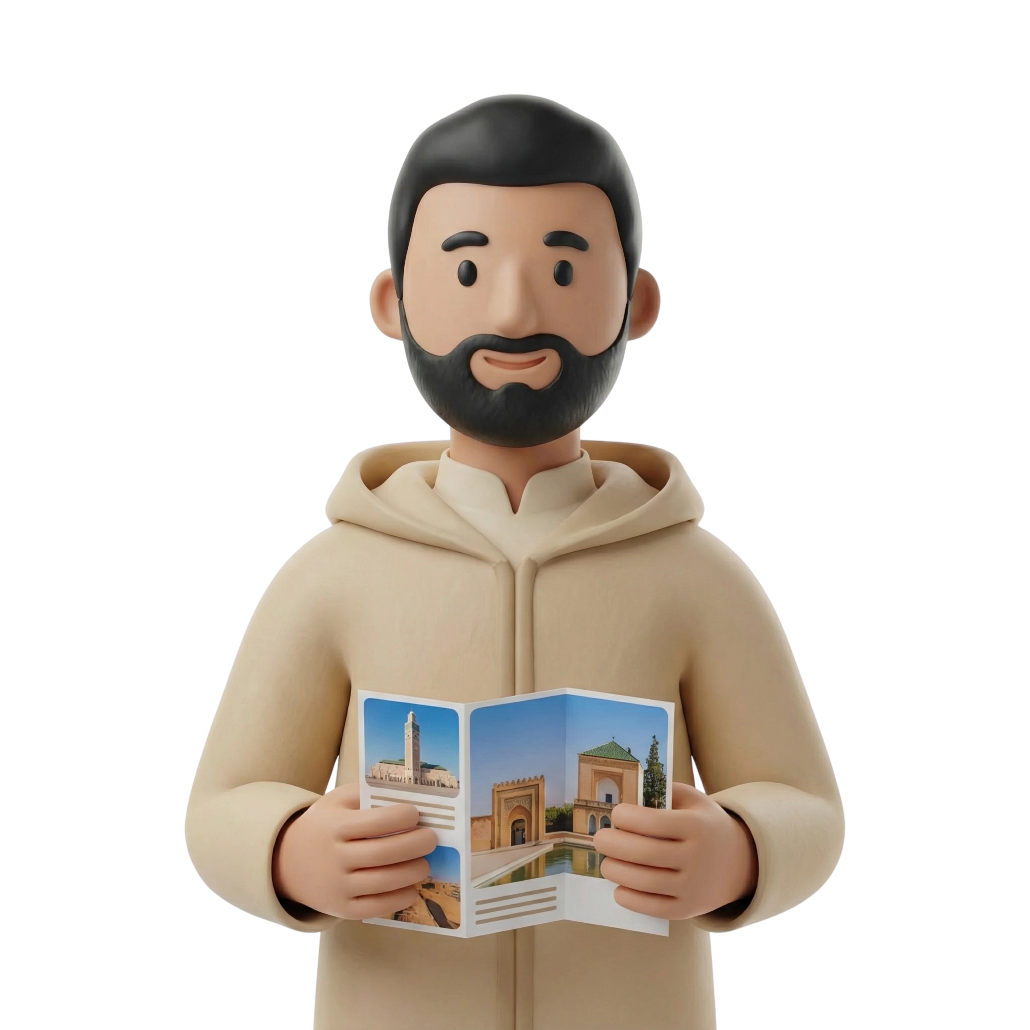 A friendly Moroccan tour guide welcomes travelers while showcasing iconic local landmarks. Dressed in a traditional beige djellaba, he offers cultural insight and historical context for a rich travel experience.