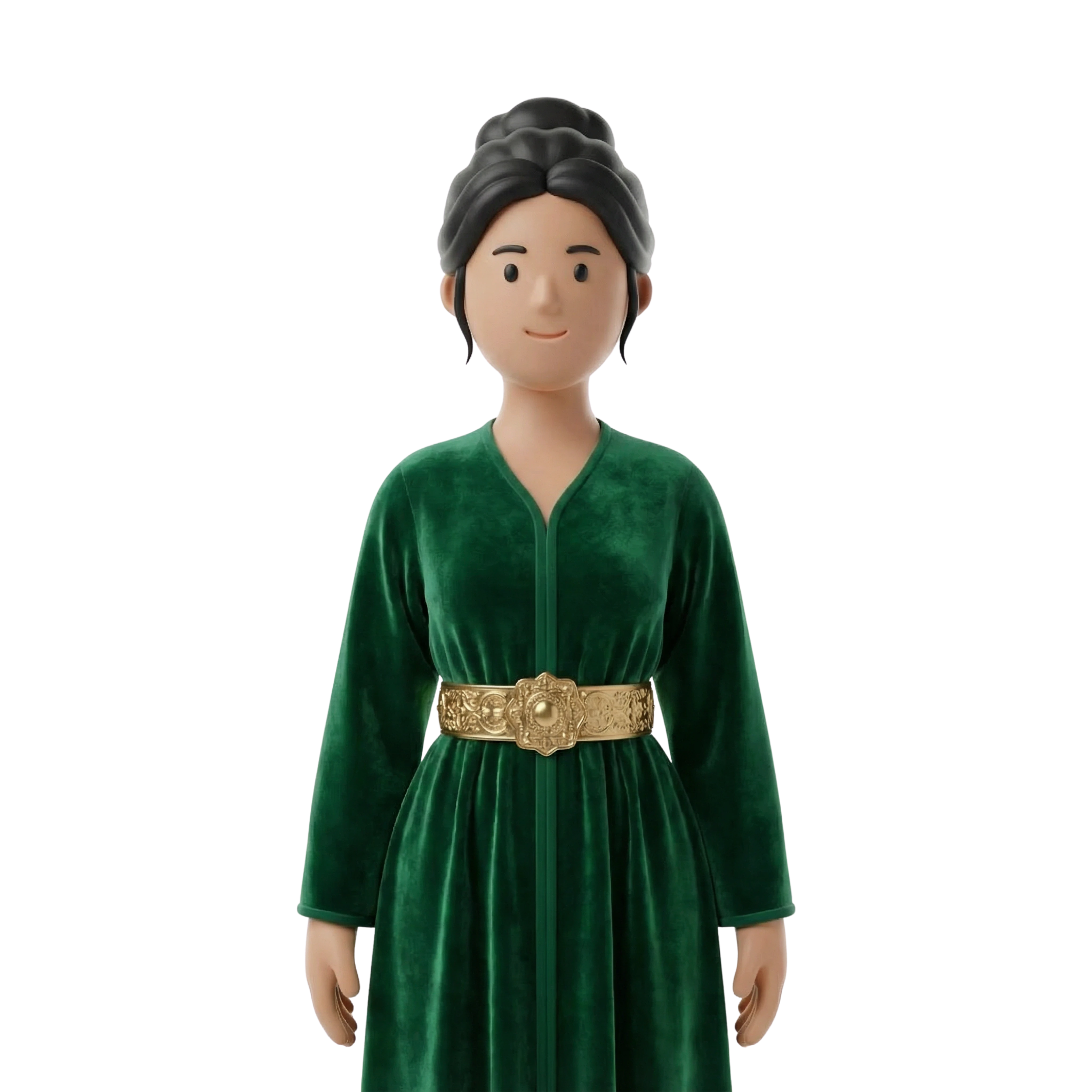 امرأة مغربية أنيقة ترتدي قفطاناً أخضر فخماً بحزام ذهبي مزخرف، تجسد الفخر الثقافي والأناقة التقليدية في المناسبات الاجتماعية والاحتفالات.