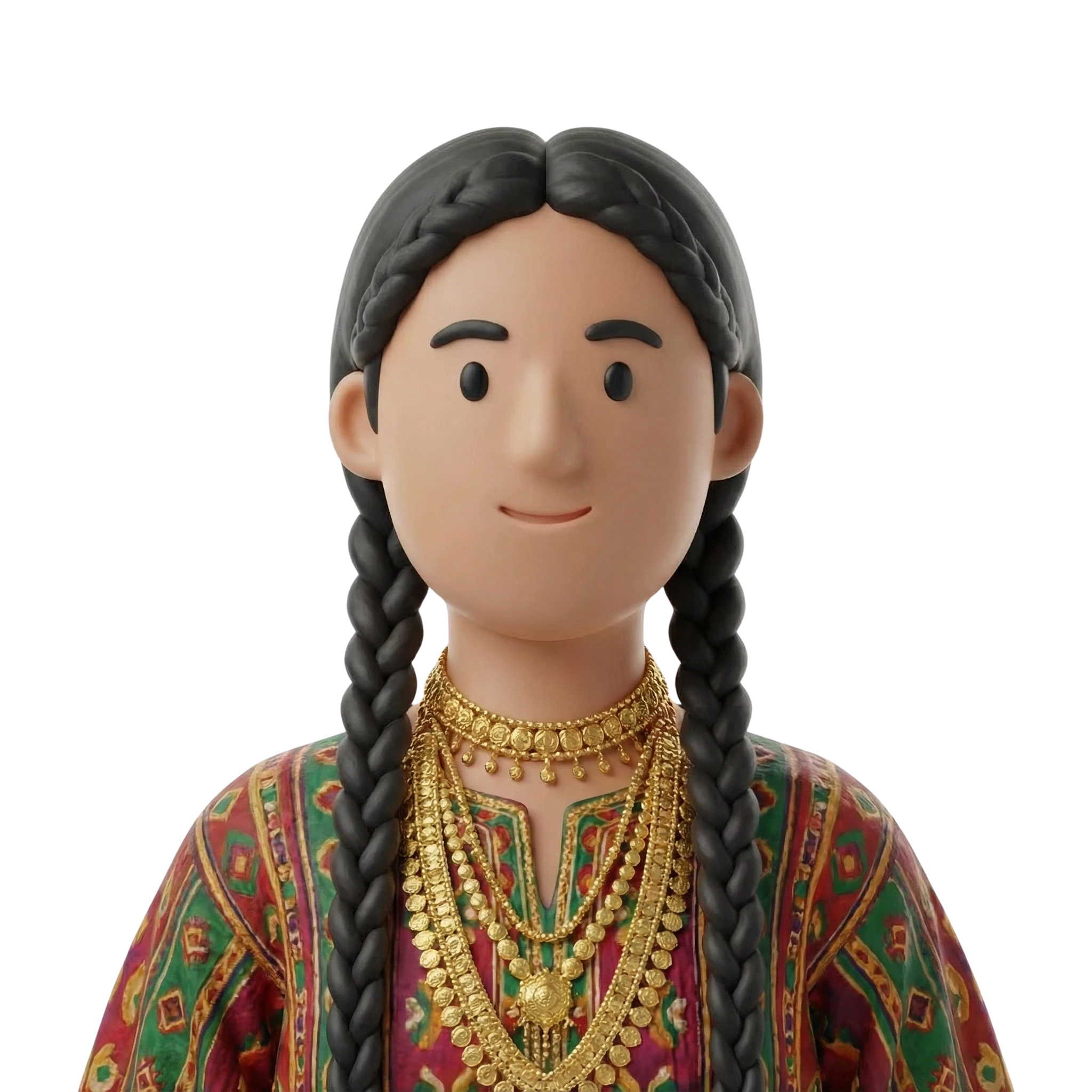 فتاة نجدية شابة ترتدي زياً تقليدياً زاهياً مزيناً بالمجوهرات الذهبية المتقنة، تجسد عمق التراث الثقافي لمنطقة نجد في قلب السعودية.