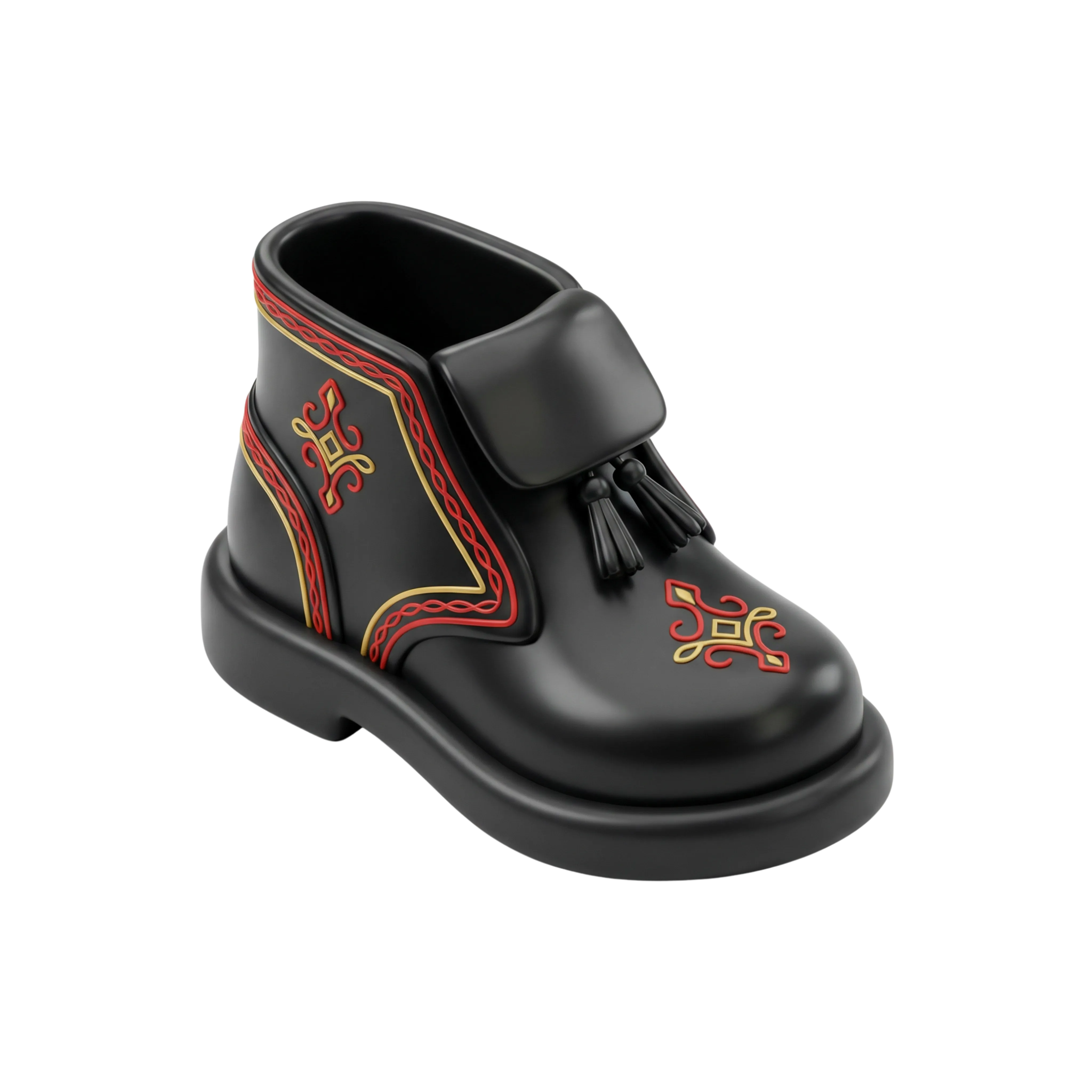 A high-quality 3D render of a traditional Palestinian Dabke shoe, featuring a matte black leather-like texture, accented with red and yellow heritage embroidery and tassel detailing. Commonly worn during folkloric dance performances, this cultural footwear is ideal for use in heritage presentations, AR/VR content, and artistic renderings.