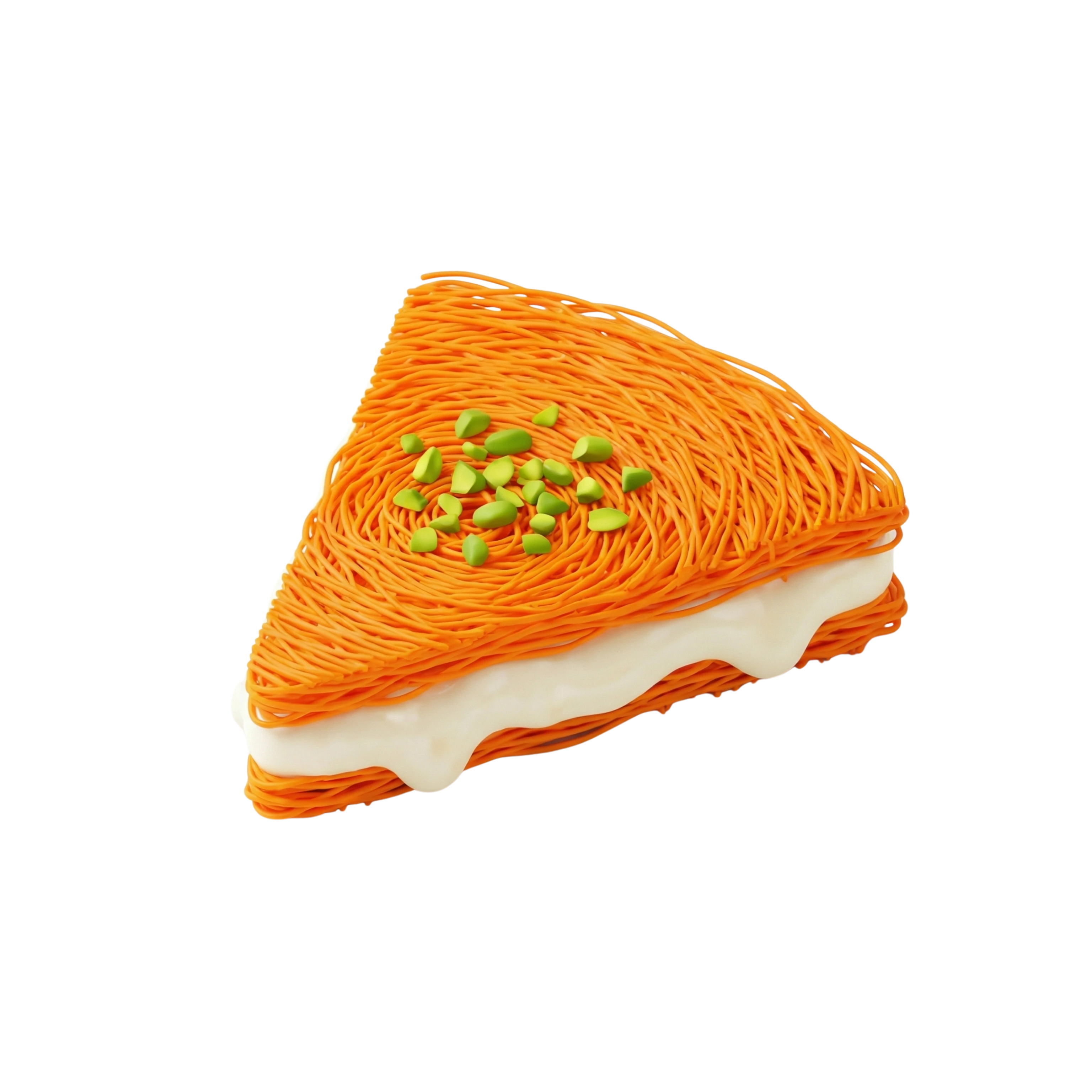 حلوى شرق أوسطية شهية مصنوعة من عجينة الكنافة الرفيعة والمقرمشة، محشوة بالقشطة الحلوة وتُروى بشراب السكر العطري. تُزين بفستق مطحون لإضفاء نكهة غنية وقوام متوازن بين القرمشة والنعومة.