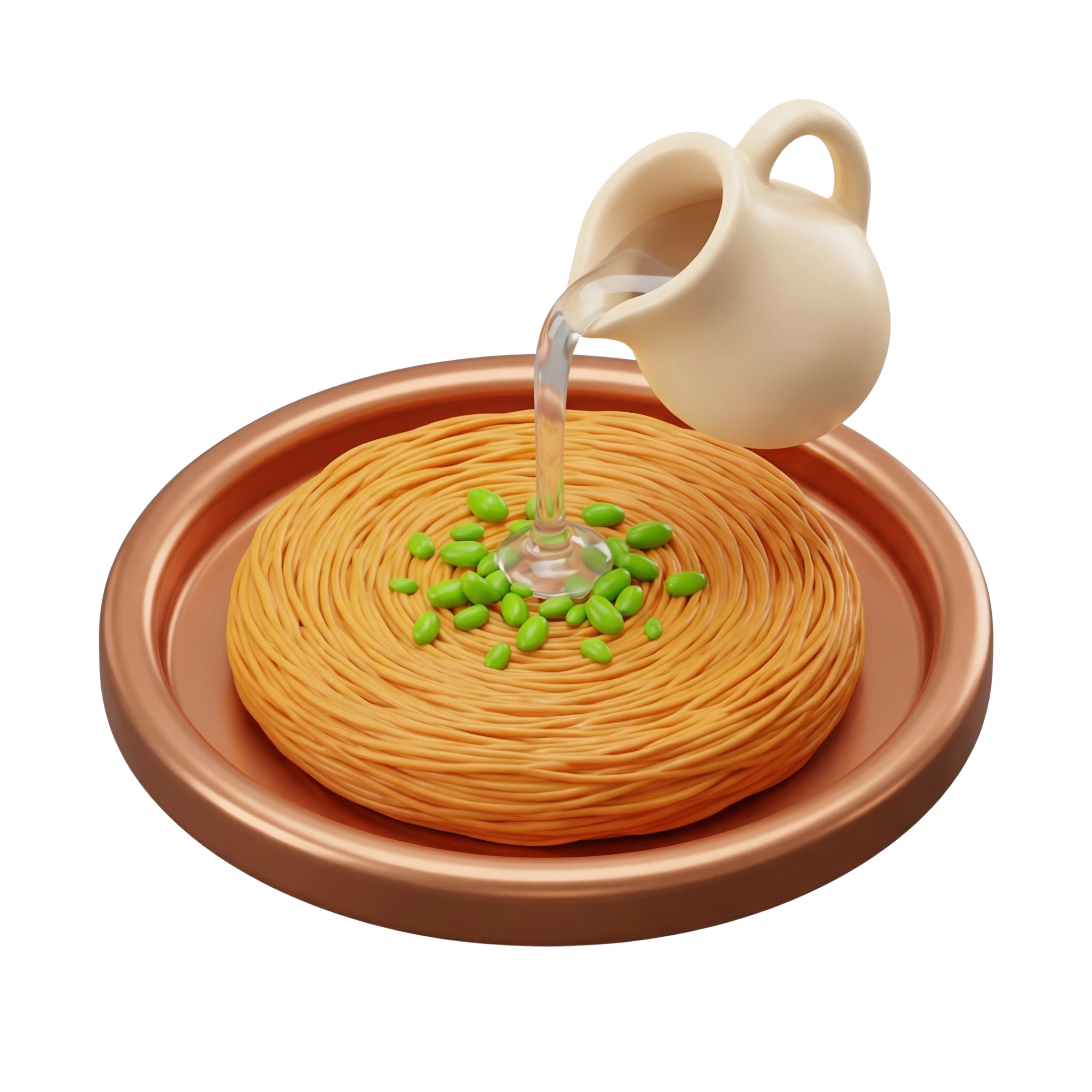 This traditional Palestinian Kunafa features crisp, golden strings of shredded phyllo dough filled or topped with rich cheese or cream. It's finished with a generous drizzle of fragrant sugar syrup and crushed pistachios, offering a contrast of textures—crispy exterior with a gooey, smooth center and a sweet, nutty finish.