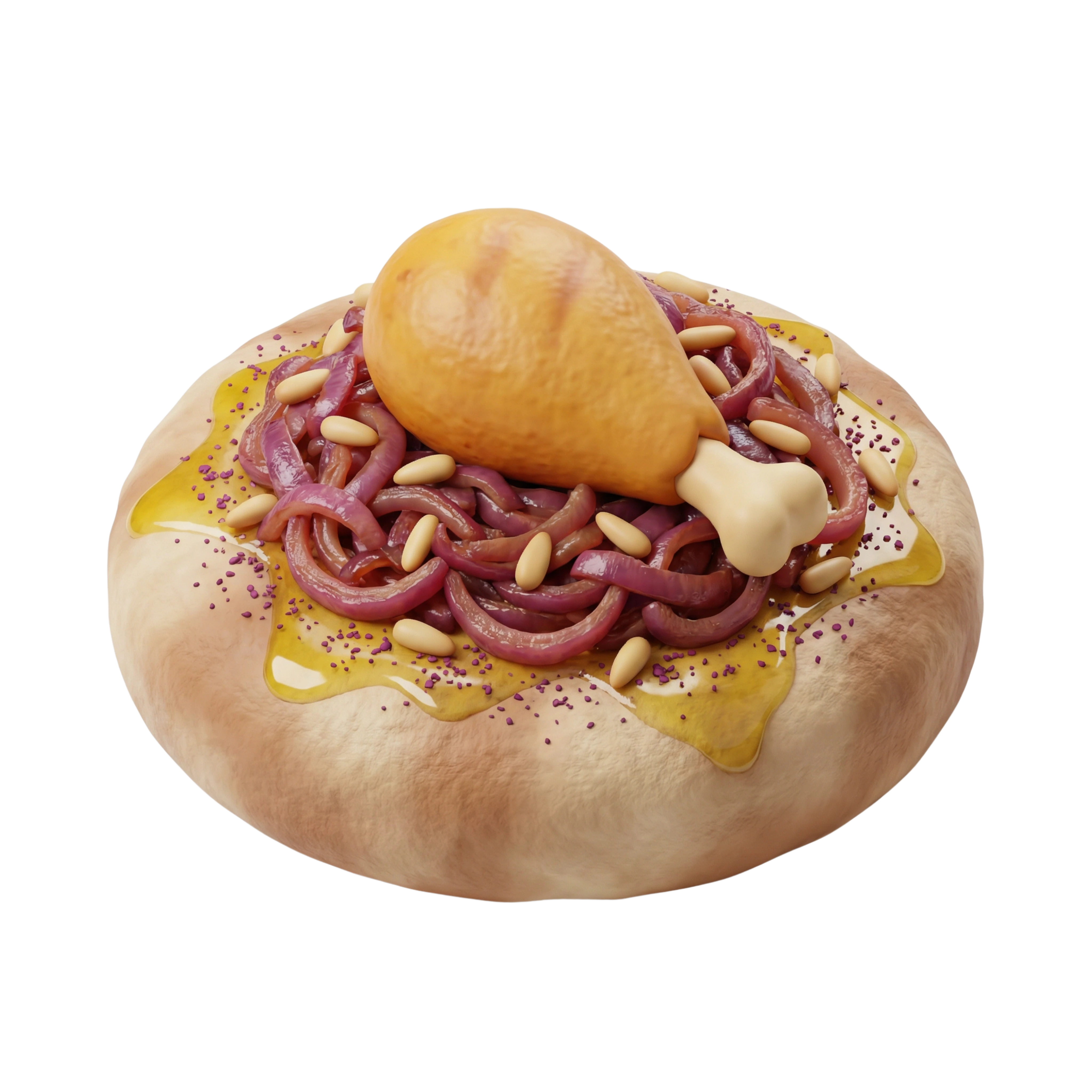 Msakhan is a vibrant Palestinian dish made with tender roasted chicken on a bed of caramelized onions deeply infused with tart sumac, served over traditional taboon bread. Drizzled generously with rich olive oil and garnished with toasted pine nuts, it delivers a perfect harmony of savory, tangy, and nutty flavors with a satisfying chewy-crispy texture.