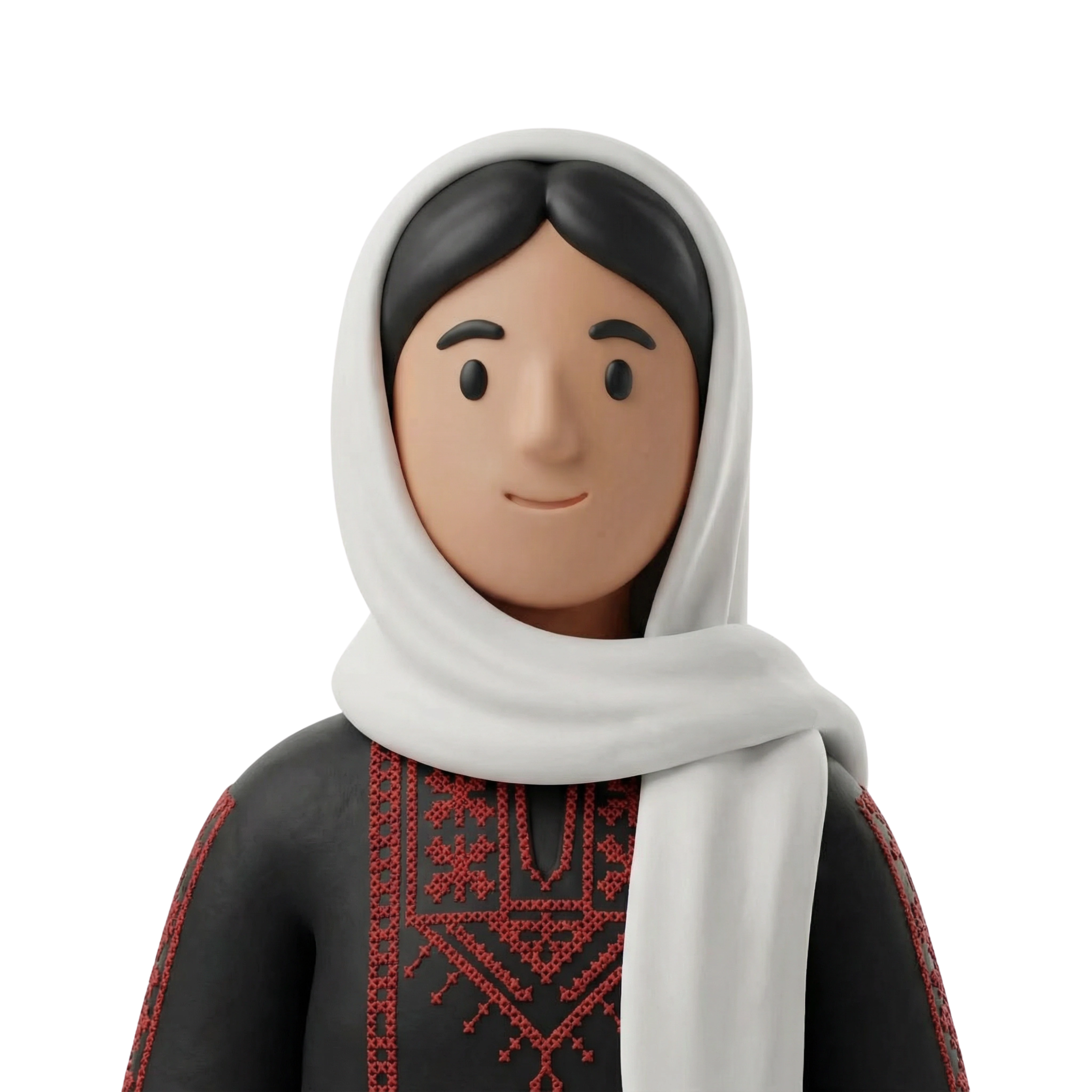 امرأة فلسطينية ترتدي زيًا تقليديًا في تصميم ثلاثي الأبعاد بأسلوب ودود، بثوب أسود مزين بتطريز أحمر (تطريز فلسطيني) وحجاب أبيض، تعكس الفخر بالهوية والتراث الثقافي.