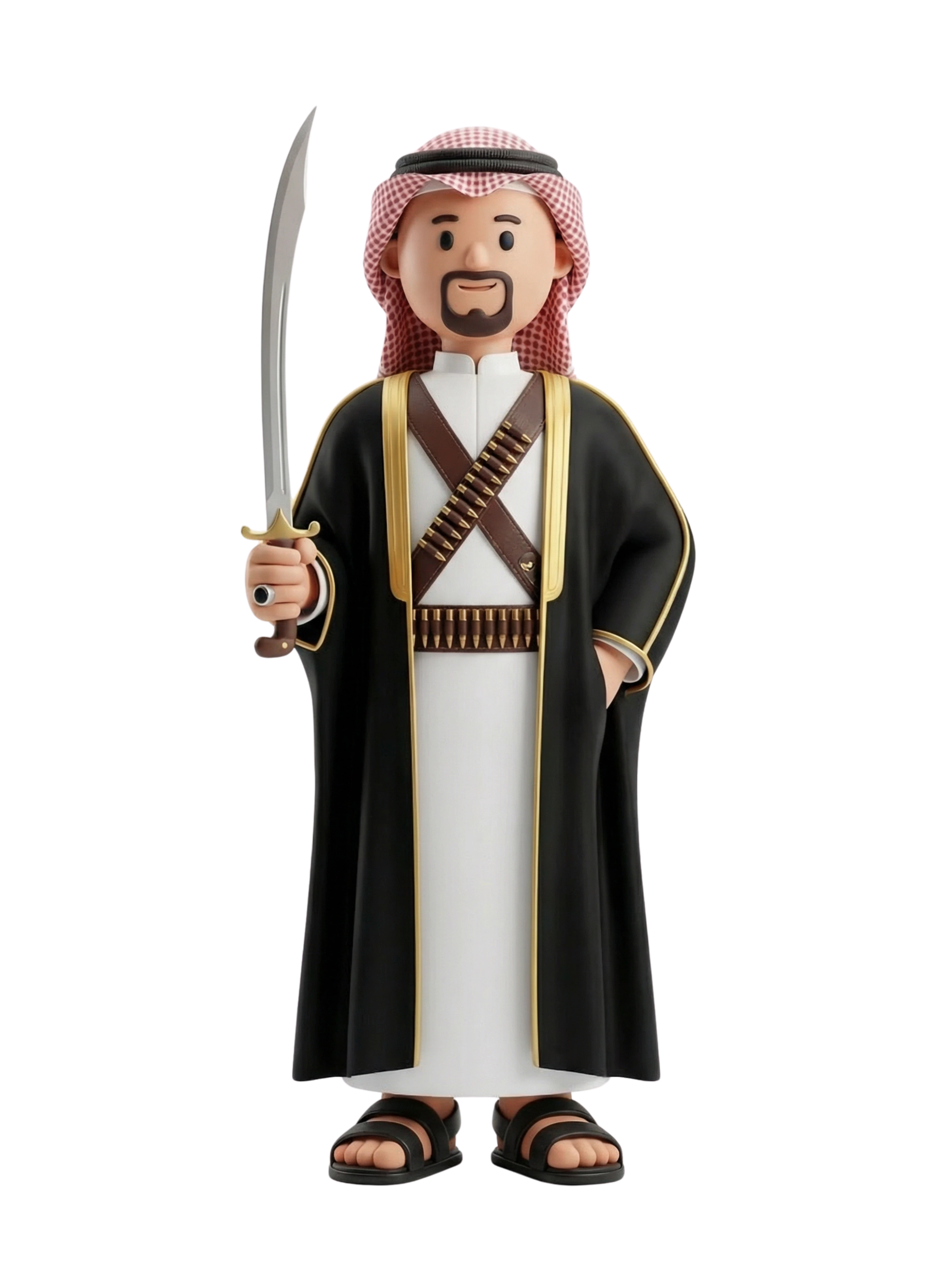 A proud Ardah dancer clad in traditional Saudi attire, wielding a sword and dressed for a cultural celebration. His outfit, complete with a bisht, leather bullet belts, and shemagh, symbolizes rich heritage and national pride.