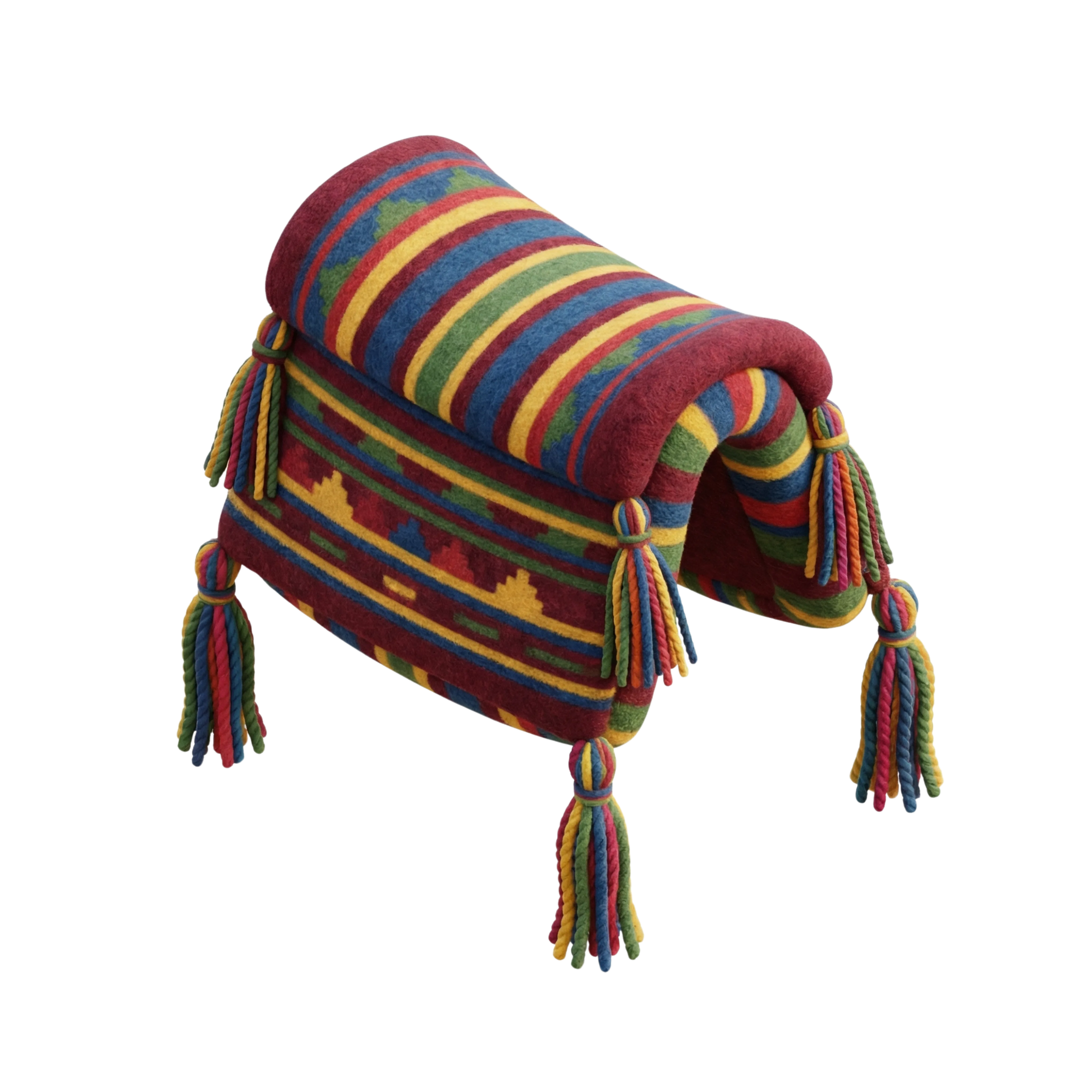 مجسم ثلاثي الأبعاد مفصل لسرج جمل تقليدي على الطراز السعودي، يتميز بنقوش تراثية زاهية وأطراف مزينة بالشرابات. يتمتع السرج بملمس نسيجي غير لامع، مما يجعله مثالياً للاستخدام في العروض الثقافية، والمعارض التراثية، أو وسائط السياحة.