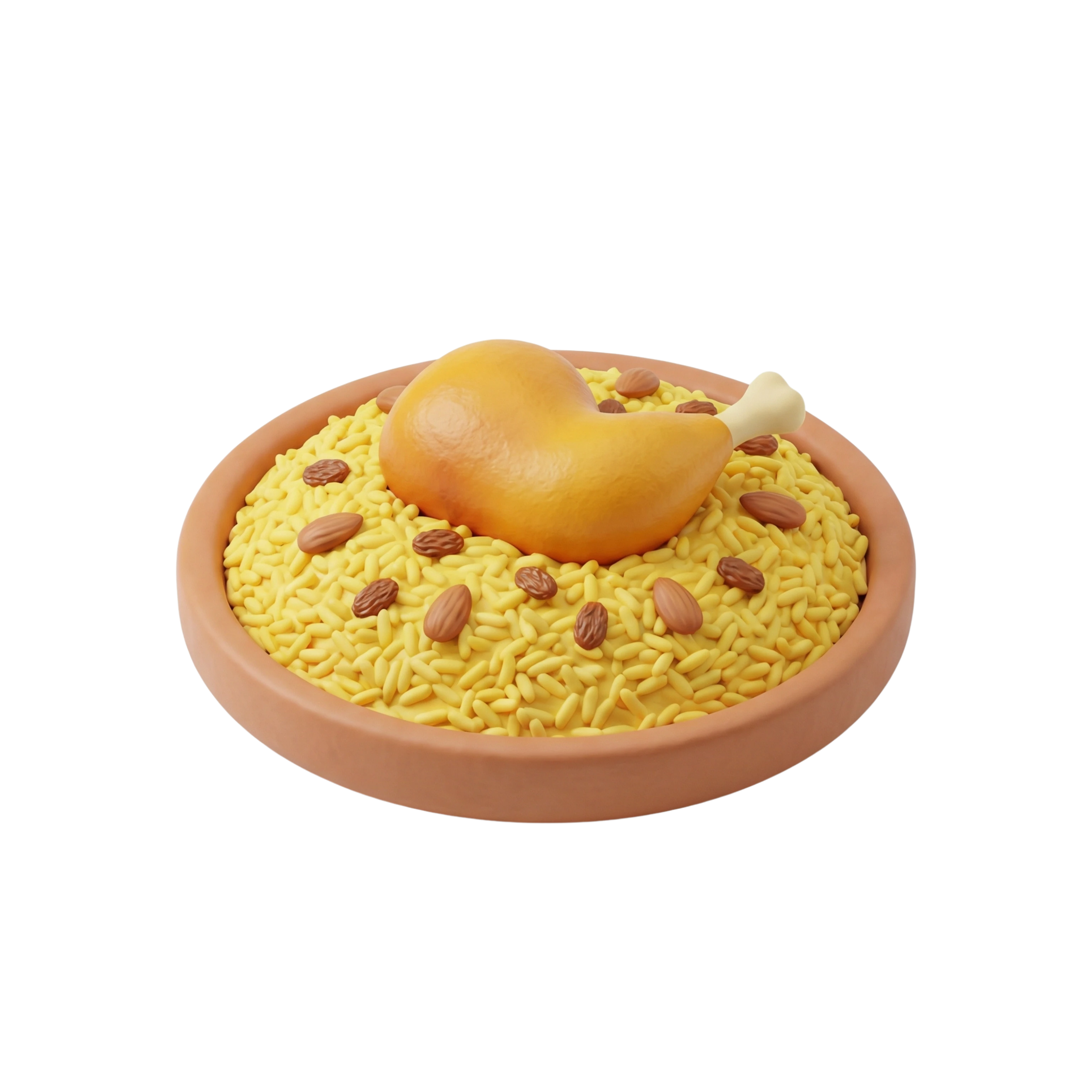 A fragrant and spiced rice dish featuring tender chicken leg, infused with rich flavors of cardamom, cinnamon, and cloves, topped with toasted almonds and sweet raisins for a perfect sweet-savory balance.