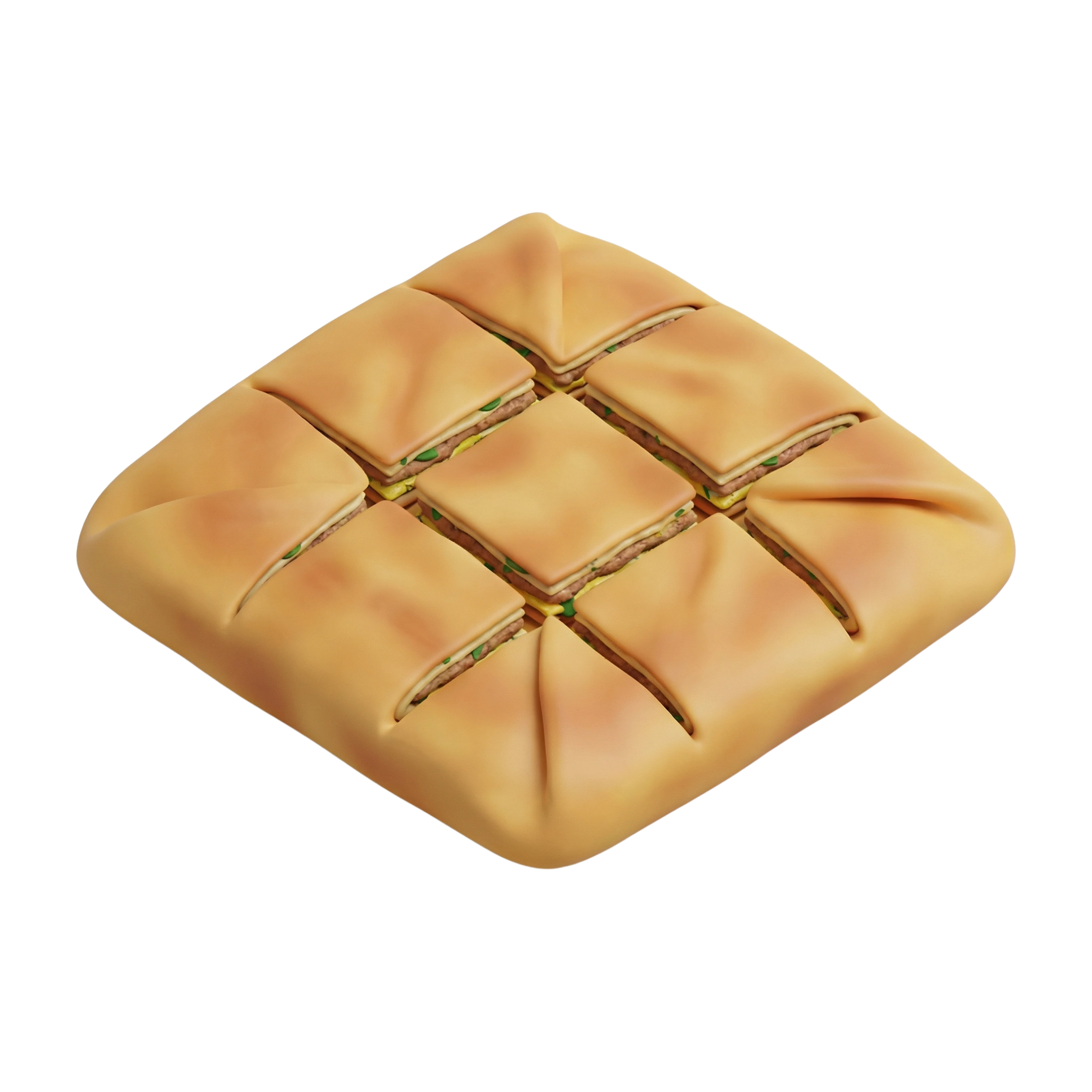 A crispy, golden-brown pastry stuffed with a savory mixture of minced meat, onions, scallions, and spices. Each bite delivers a delightful contrast between the flaky outer layers and the juicy, flavorful filling inside.