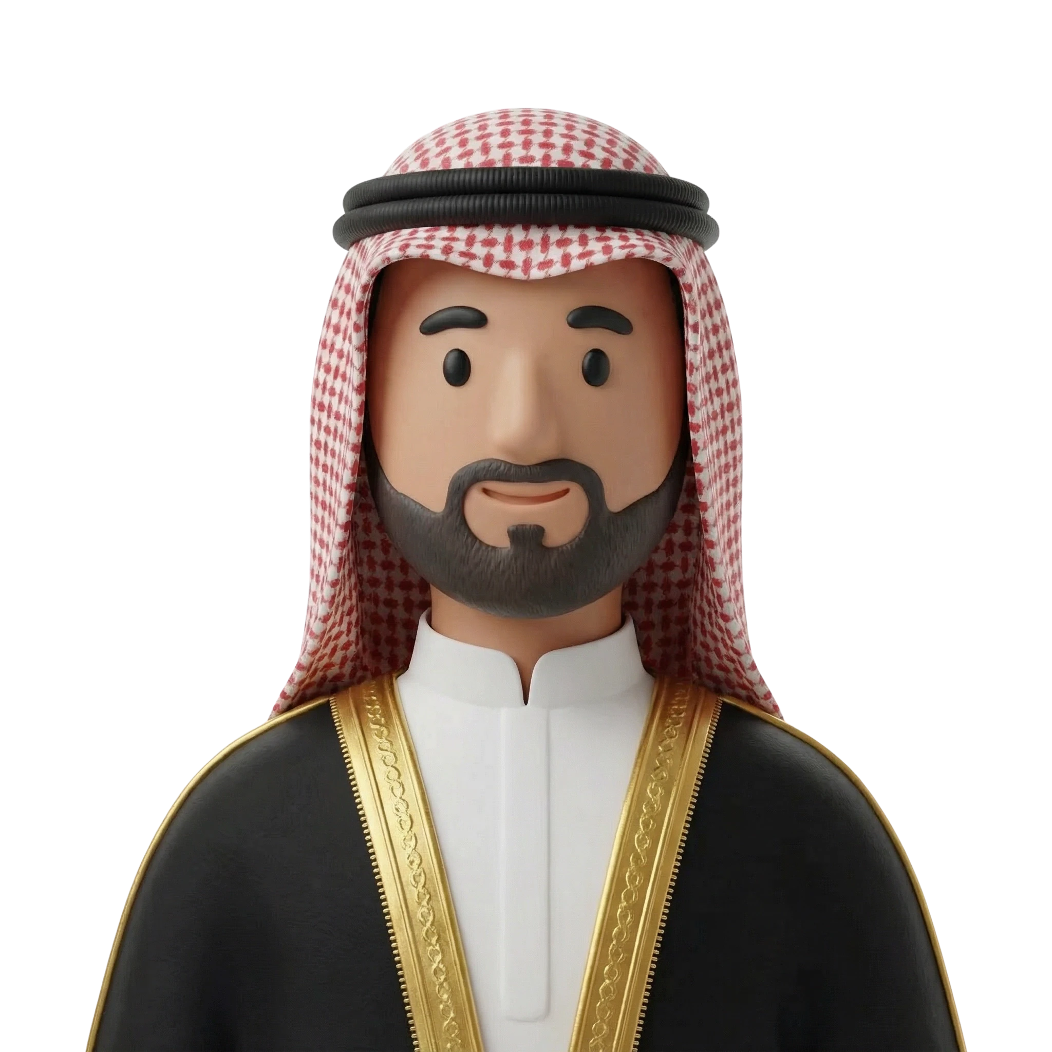 ضيف زفاف مميز يرتدي الزي السعودي التقليدي، يشمل الشماغ الأحمر والأبيض والثوب الأبيض والبشت الأسود المطرز بخيوط ذهبية، في تعبير عن الفخر الثقافي والرسمية في مناسبة ملكية.