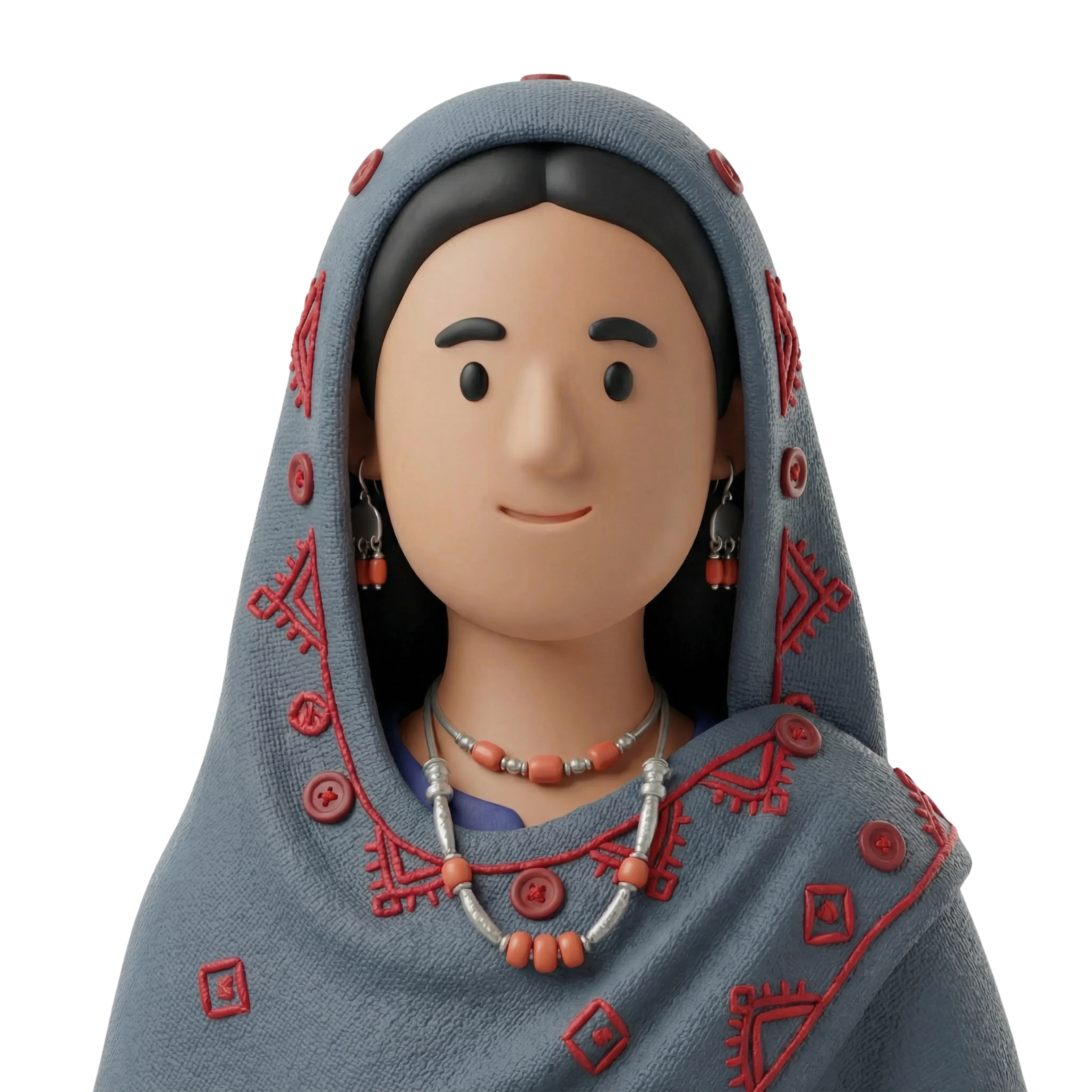 فتاة مبهجة من واحة سيوة في مصر ترتدي الزي الأمازيغي التقليدي، مع تطريزات دقيقة وحلي فضية وخرز مرجاني، تجسد الحفاظ على التراث الثقافي في شمال أفريقيا.