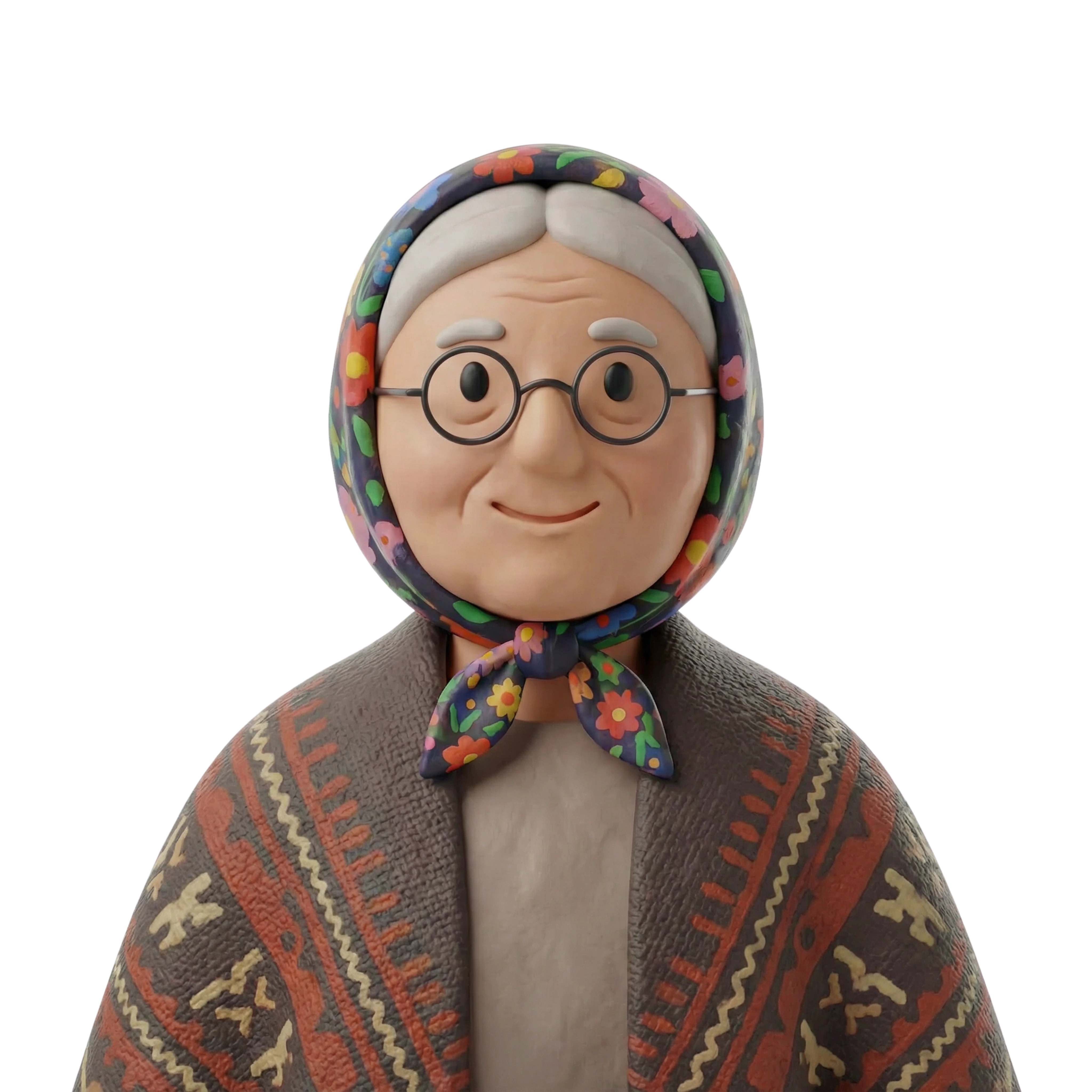 سيدة مسنّة دافئة وذات حكمة ترتدي الزي الشعبي السلافي التقليدي، بما في ذلك وشاح رأس مزخرف بالأزهار ووشاح منسوج، مما يعكس التراث الثقافي واستمرارية الأجيال.