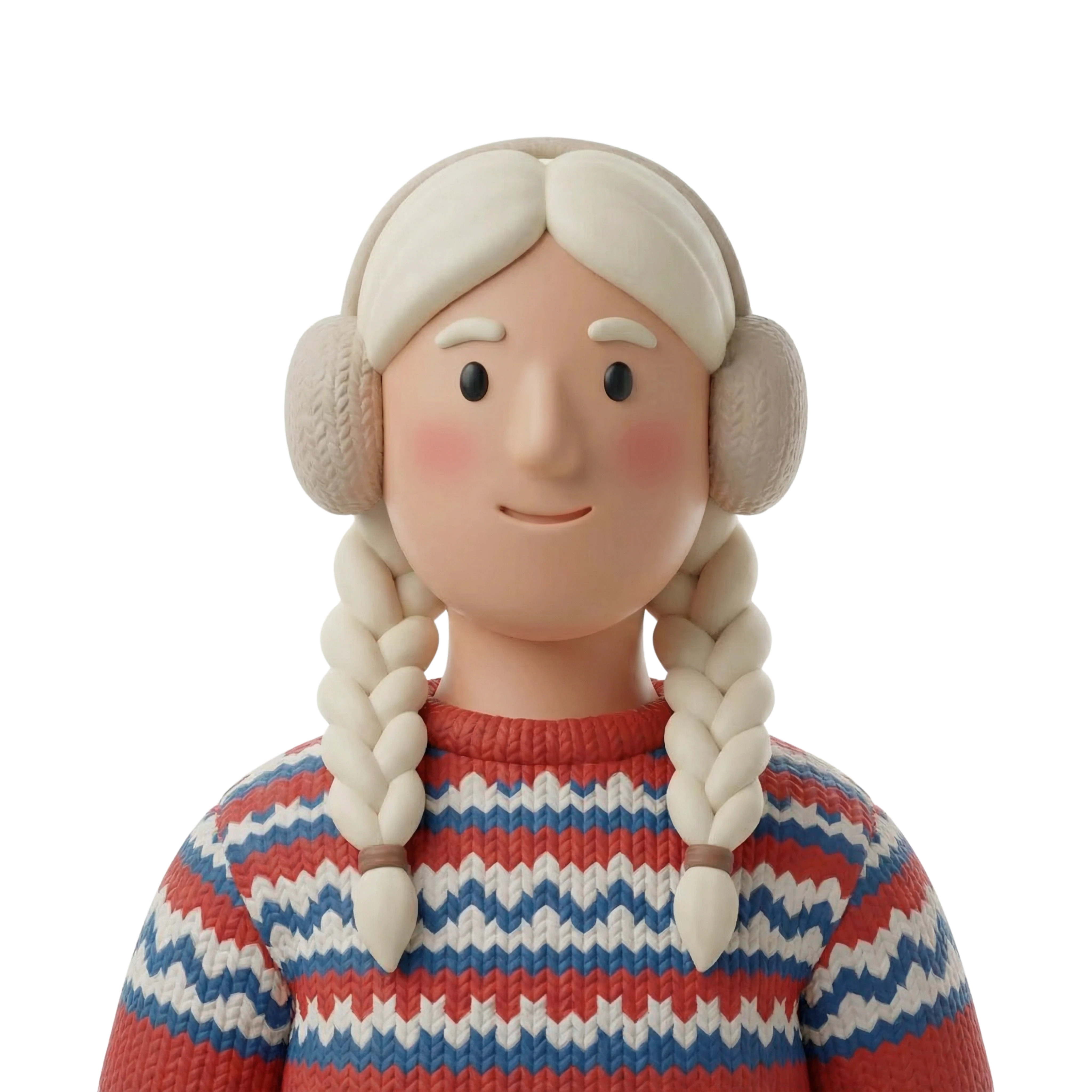 امرأة مرحة ترتدي زيًا شتويًا تقليديًا من شمال أوروبا، يتميز بسويتر مزخرف وسماعات أذن صوفية، يعكس دفء وأناقة الثقافة الاسكندنافية.