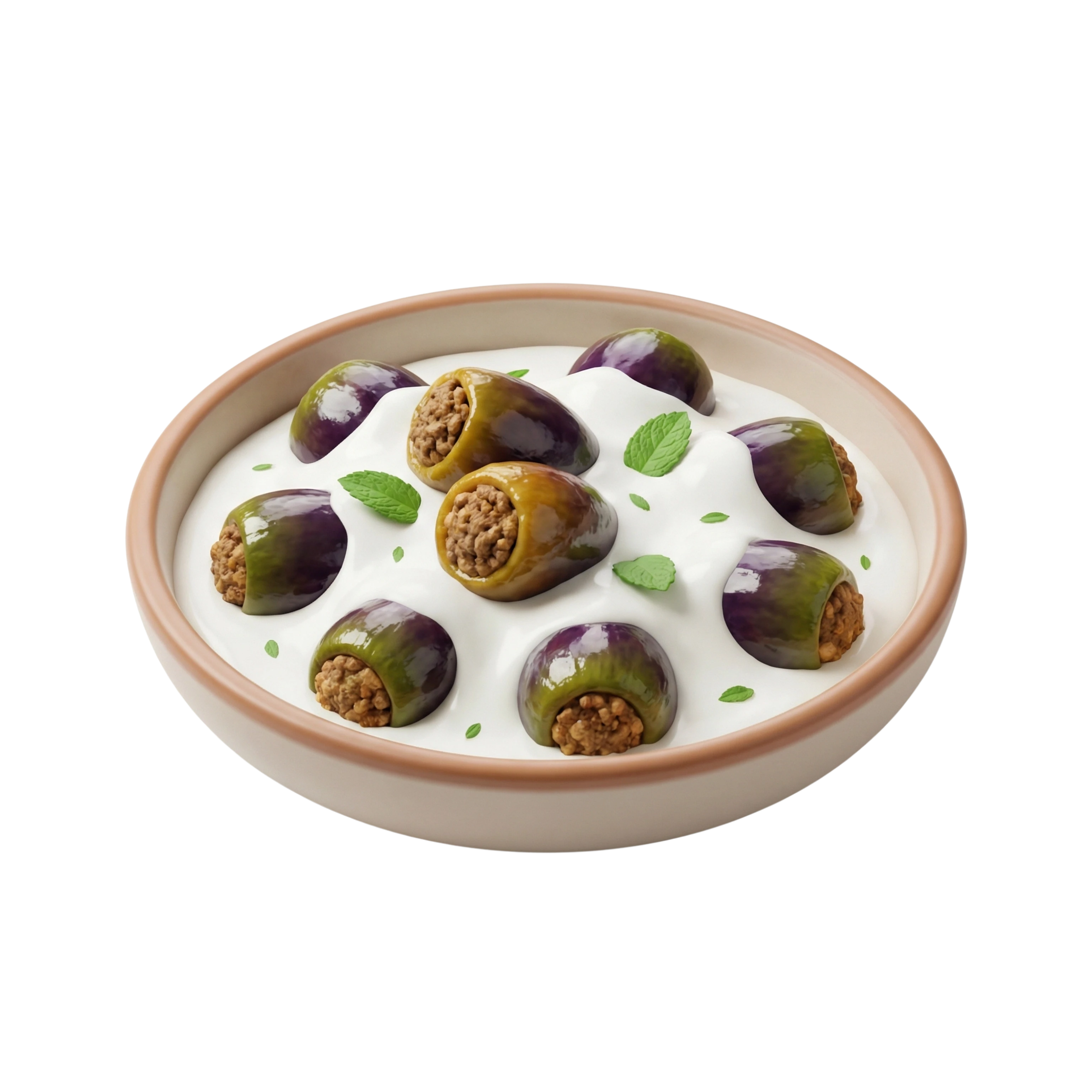 شيخ المحشي هو طبق سوري شهي يتكوّن من باذنجان صغير محشو بخليط لحم مفروم متبل بعناية، ويُطهى بلطف حتى يكتسب نكهة غنية وقوام طري. يُقدَّم فوق صلصة اللبن الزبادي الباردة بالثوم، مما يضفي توازناً بين الطعم الكريمي والنكهات القوية، وتُزيَّن بأوراق النعناع لمذاق منعش لا يُقاوم.