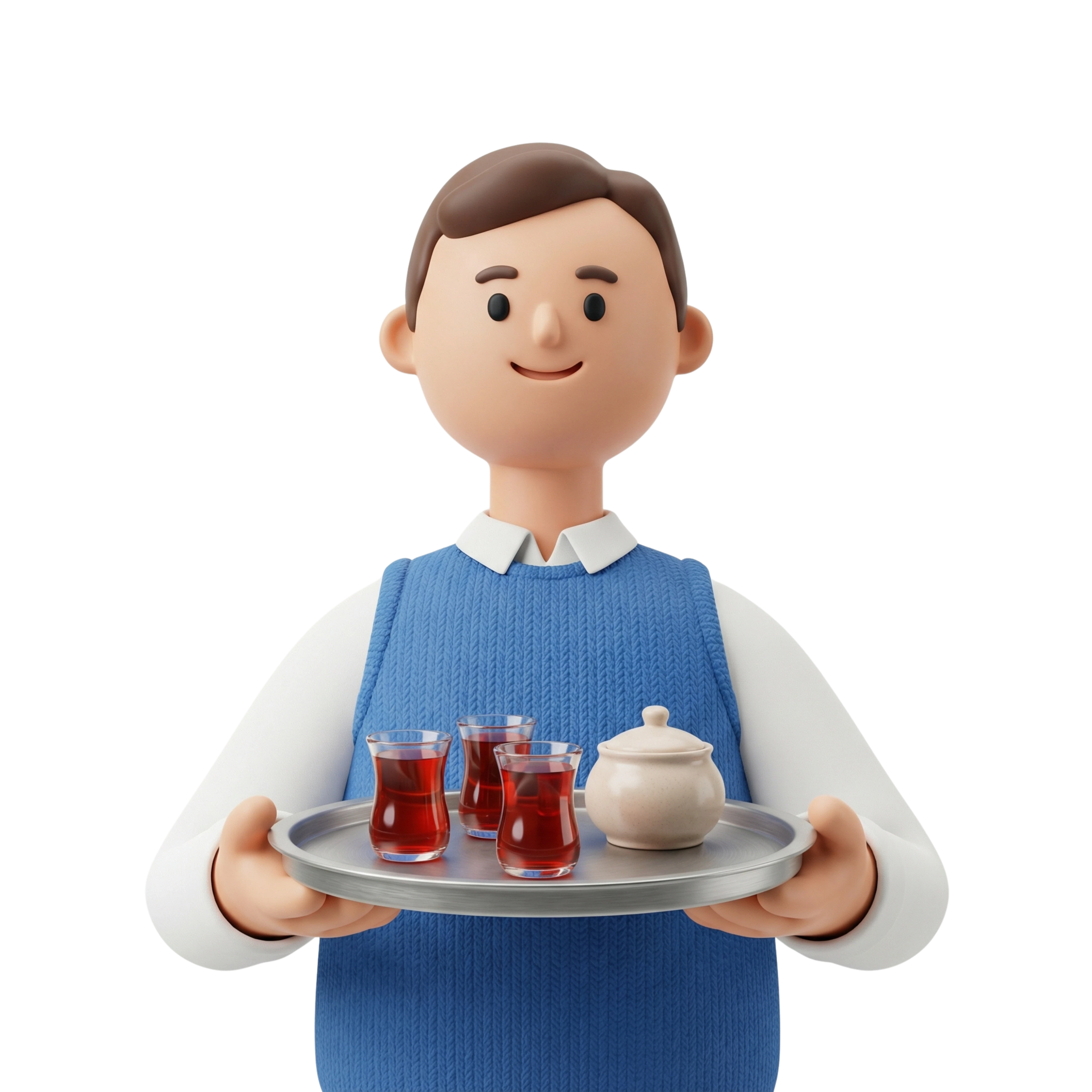 A friendly tea server presenting a traditional tea tray with warmth and hospitality, representing timeless cultural rituals in a modern presentation.