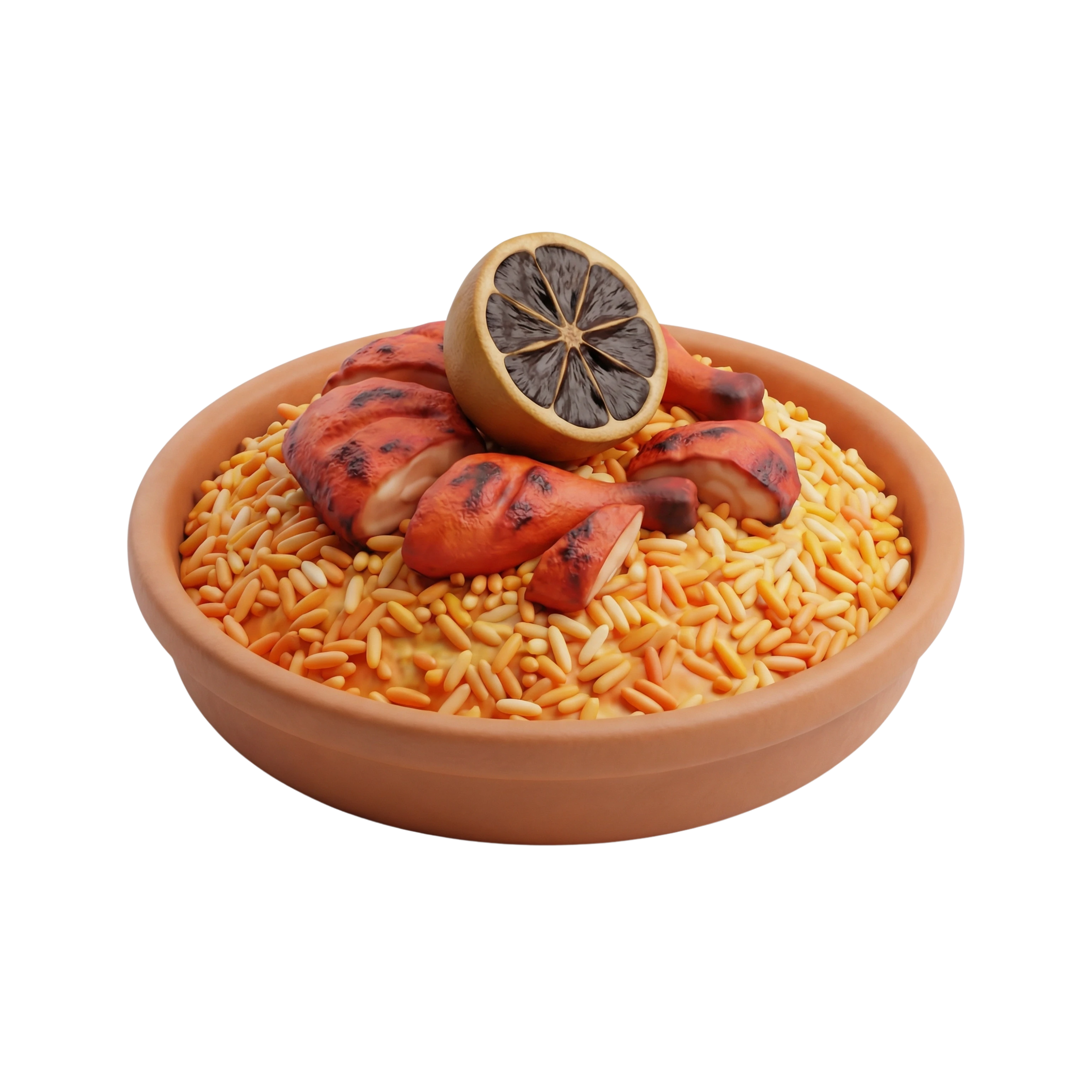 طبق معطر وشهي من الأرز المطهو ببطء والمنكه بالزعفران والتوابل، يُقدم مع دجاج مشوي طري ومتبل بعمق، وتعلوه نكهة مدخنة من الليمون الأسود المجفف. الأرز هش وخفيف، والدجاج غني بالنكهة مع لمسة مشوية مميزة.