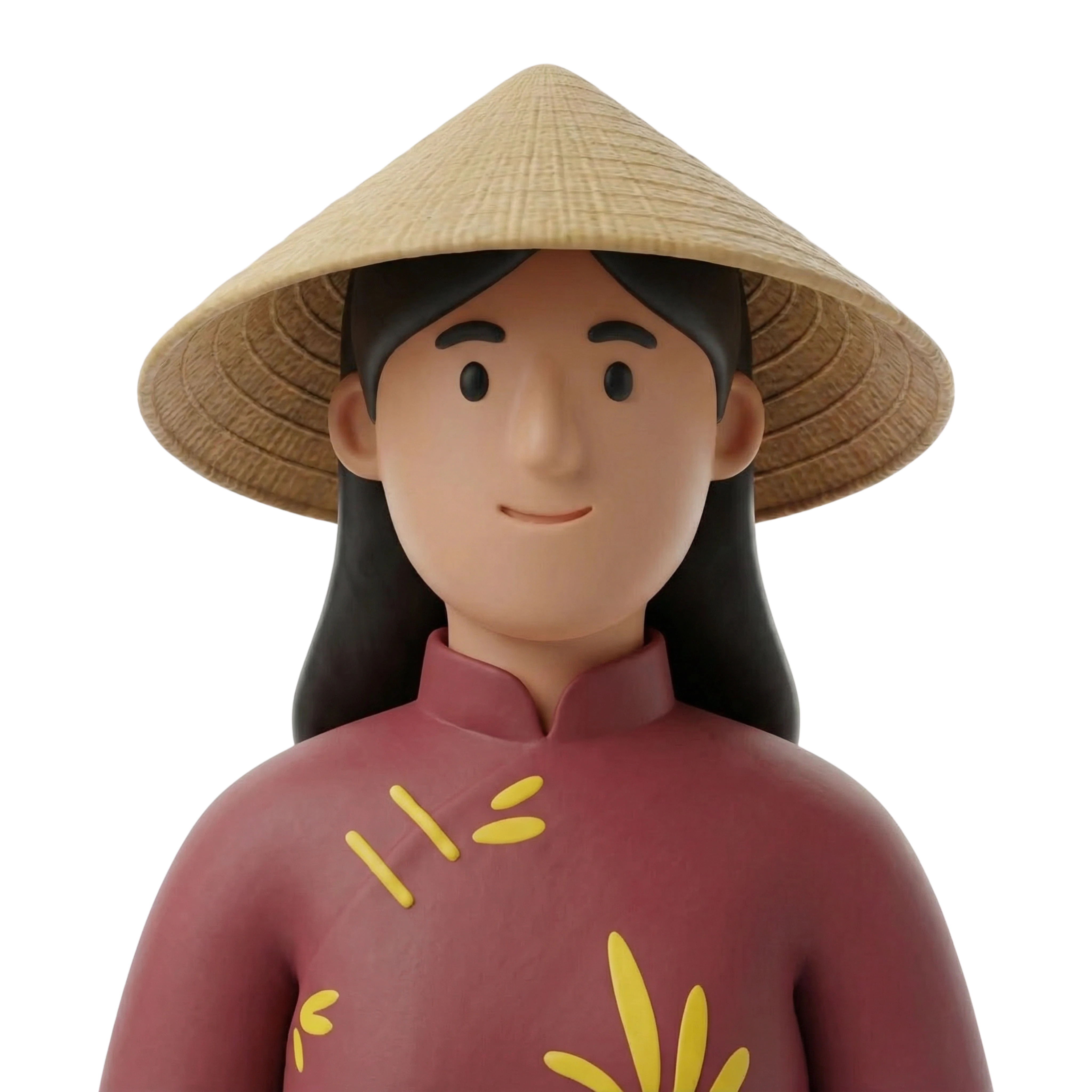 امرأة فيتنامية مبتهجة ترتدي الزي الريفي التقليدي، تشمل القبعة المخروطية (نón lá) ولباس الآو dài العنابي، مما يعكس التراث الثقافي والحياة الزراعية.