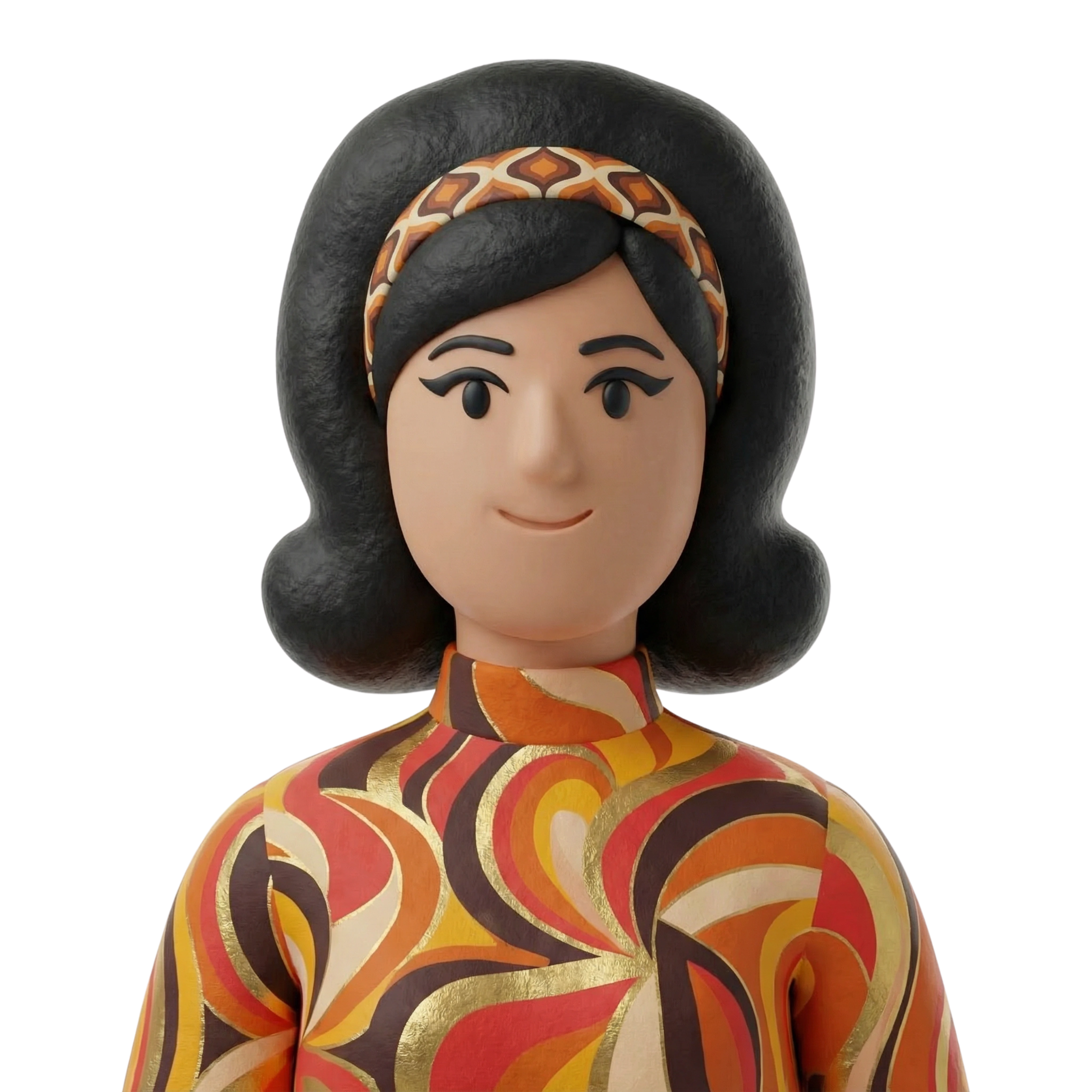 نجمة أزياء متألقة تنشر أجواء السبعينات بألوانها الجريئة وتسريحتها المميزة وابتسامتها الواثقة، مجسدة أناقة الزمن الجميل وعبق الماضي الأصيل.