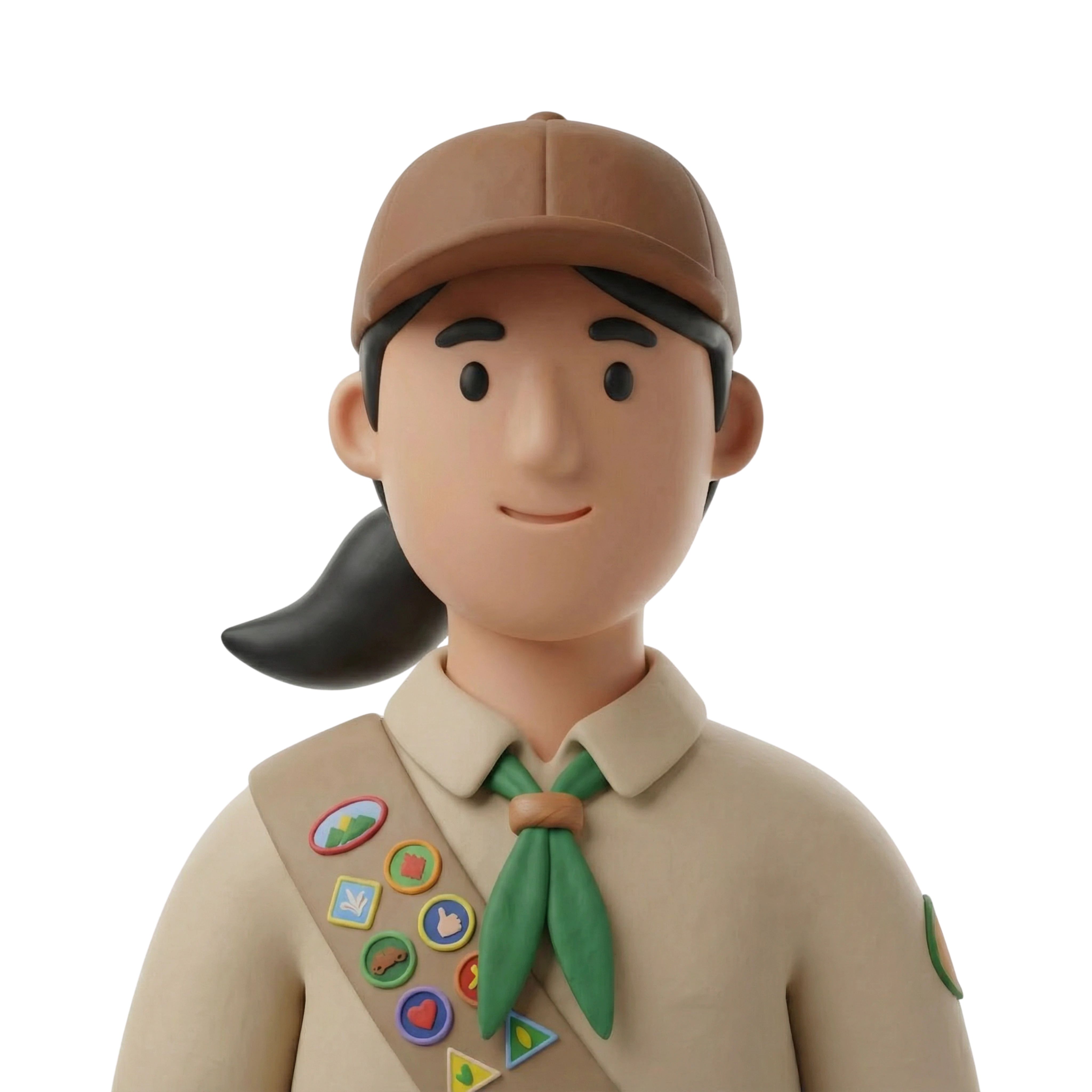 A dedicated youth scout leader proudly wearing a decorated sash, guiding young explorers through outdoor challenges and leadership development.